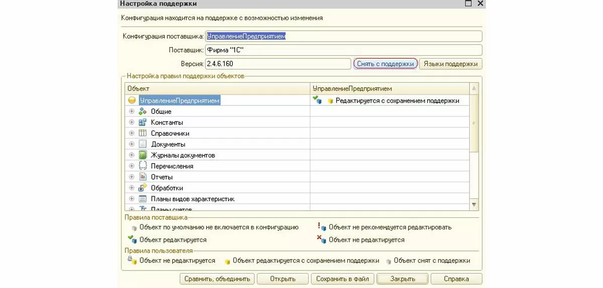 - В режиме конфигуратора на подчиненной базе РИБ, в которую не выполняется обмен, нужно снять конфигурацию с поддержки. Зайдите в меню «Конфигурация» - «Поддержка» - «Настройка поддержки…» - «Снять с поддержки»;