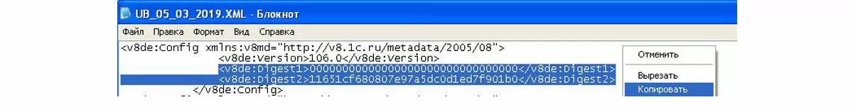 - Внутри файла обмена из основной базы найти блок хэшей, обозначенный «Digest1» и «Digest2». Его надо заменить на аналогичный из файла дочерней базы. Обратите внимание, что у второго файла Digest1 всегда содержит значение с одними нулями;