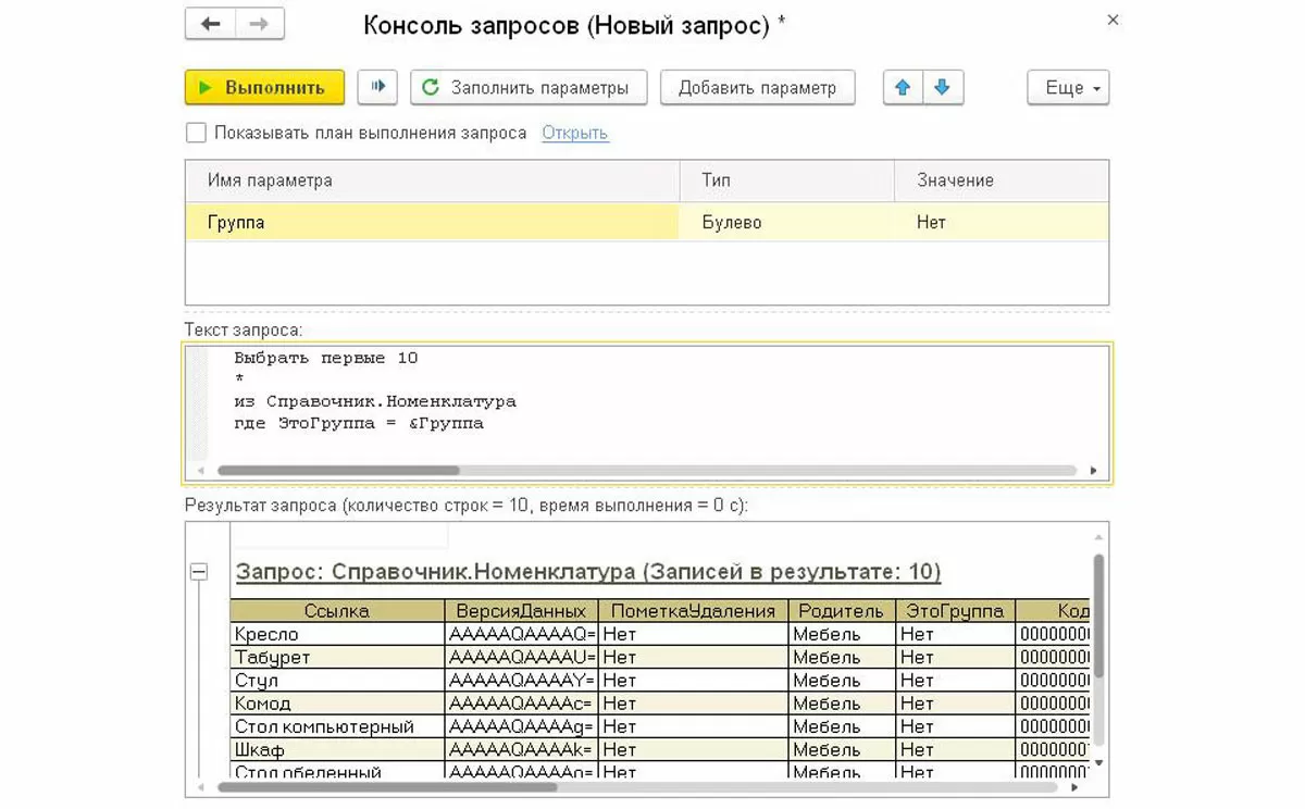 Для отладки и оптимизации запросов на языке 1С программисты вставляют текст в соответствующий раздел, заполняют параметры и проверяют результат работы. Чтобы заполнить параметры, необходимо найти соответствующую вкладку или раздел, а для запуска – нажать кнопку «Выполнить» или ее аналог – клавишу «F7». Кроме вывода перечня полей, в консоли отражается время выполнения запроса и количество строк, выведенных в соответствующий раздел.