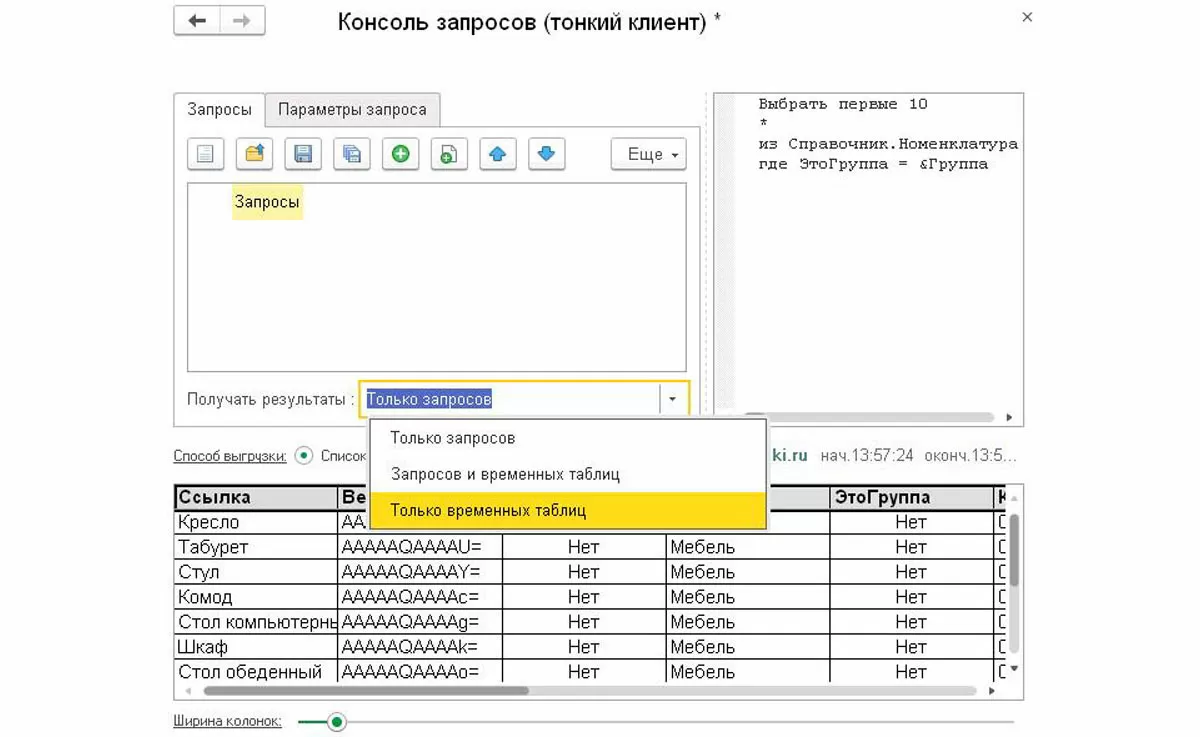 Возможности консоли запросов 1С 8.3