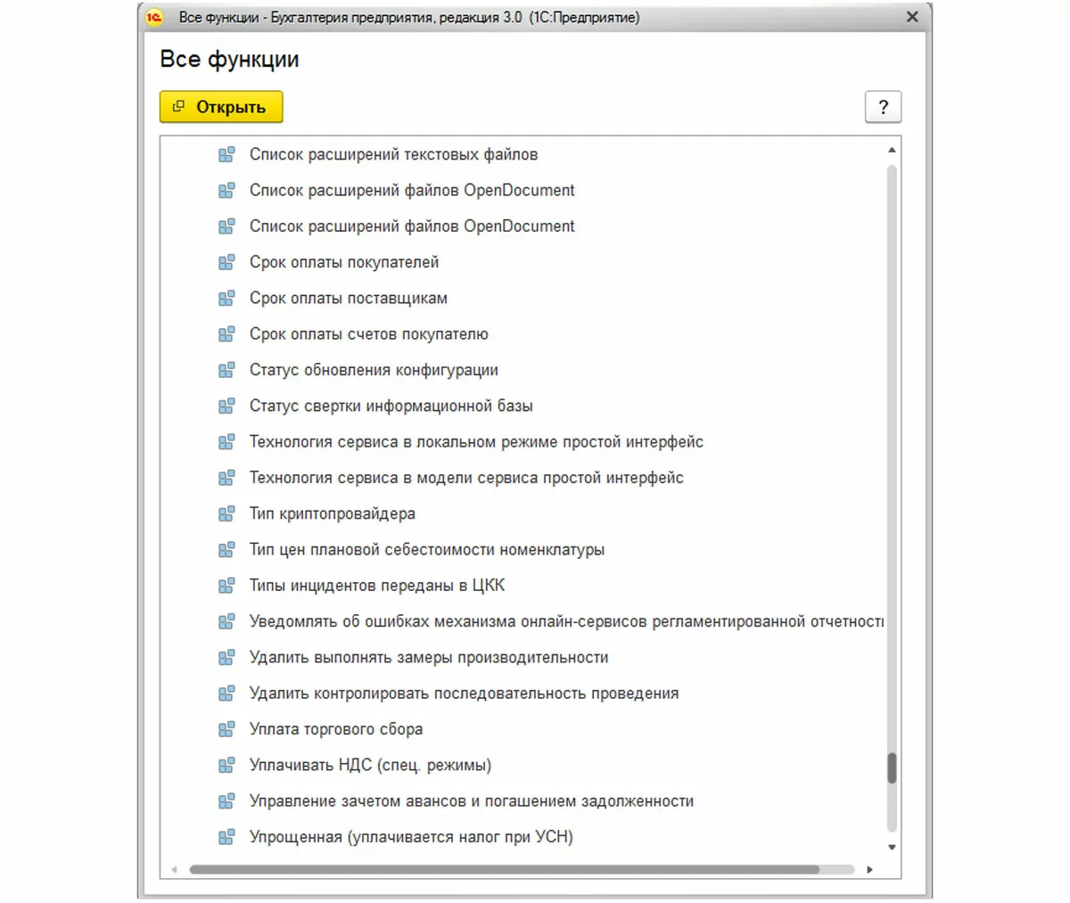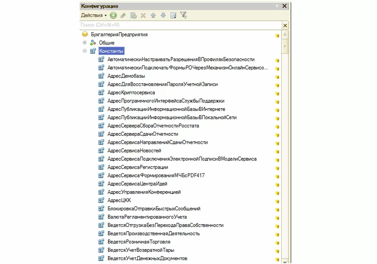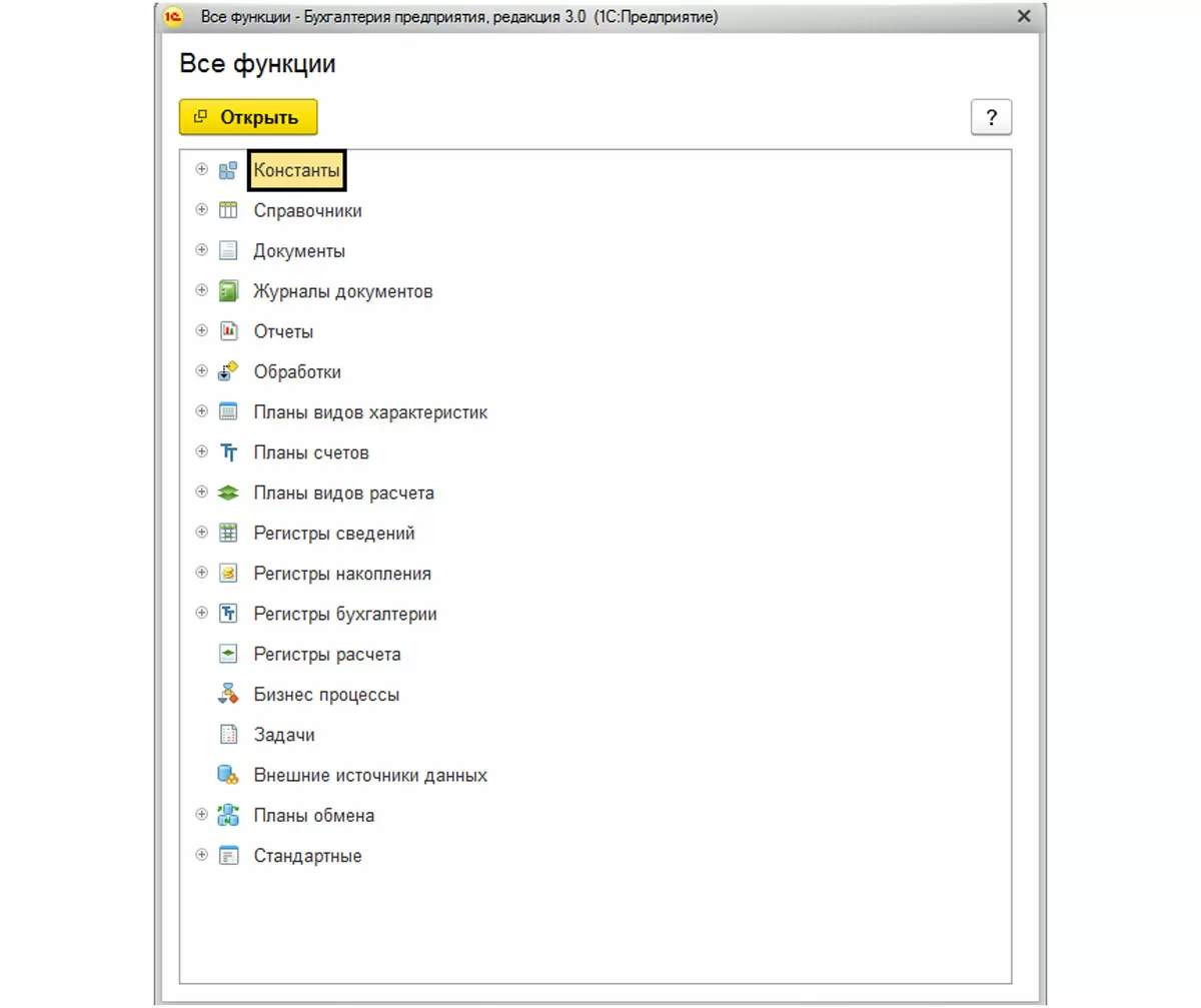 Если мы откроем нашу конфигурацию для автоматизации бухгалтерского учета на предприятии в режиме «Конфигуратор» и посмотрим структуру конфигурации, то там тоже увидим раздел «Константы» («Конфигурация» - «Открыть конфигурацию»).