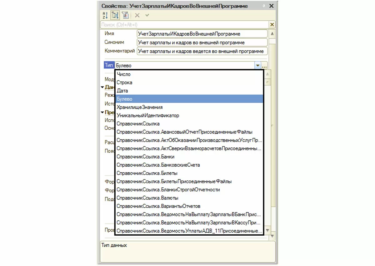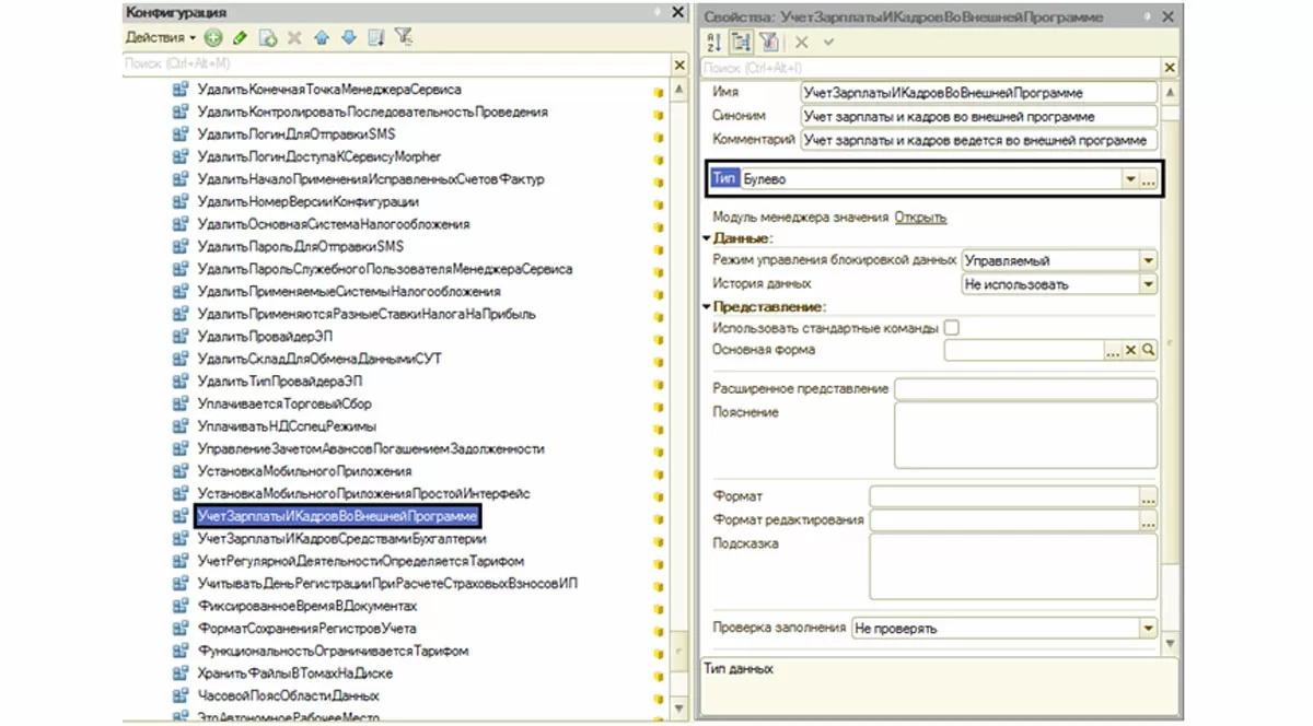 Например, откроем свойства константы «Учет зарплаты и кадров во внешней программе». Тип – «Булево». Это значит, пользователю при определении значения константы будет предоставлена возможность установить галочку.