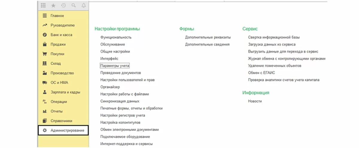 Перейдя в раздел «Функциональность», в пункте меню «Администрирование» мы можем также установить нужные нам значения по умолчанию.