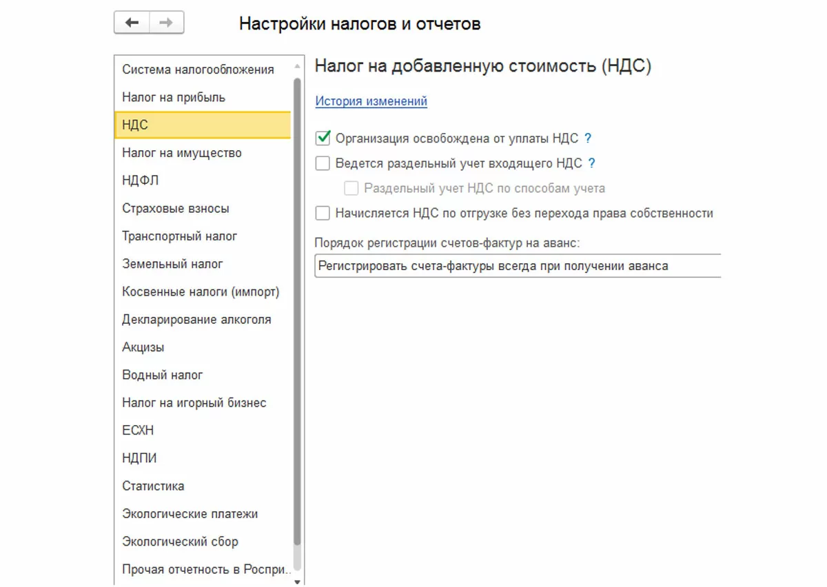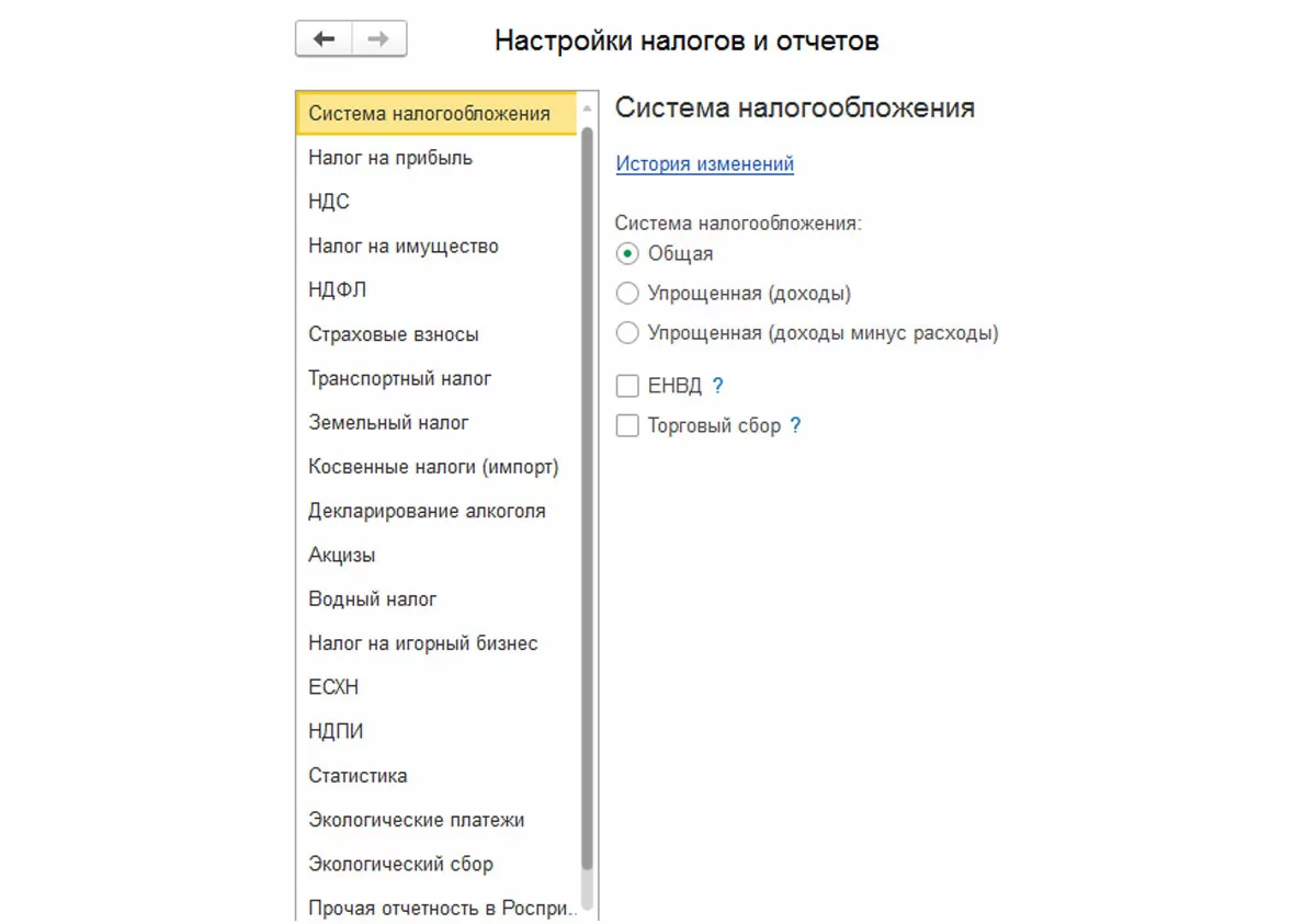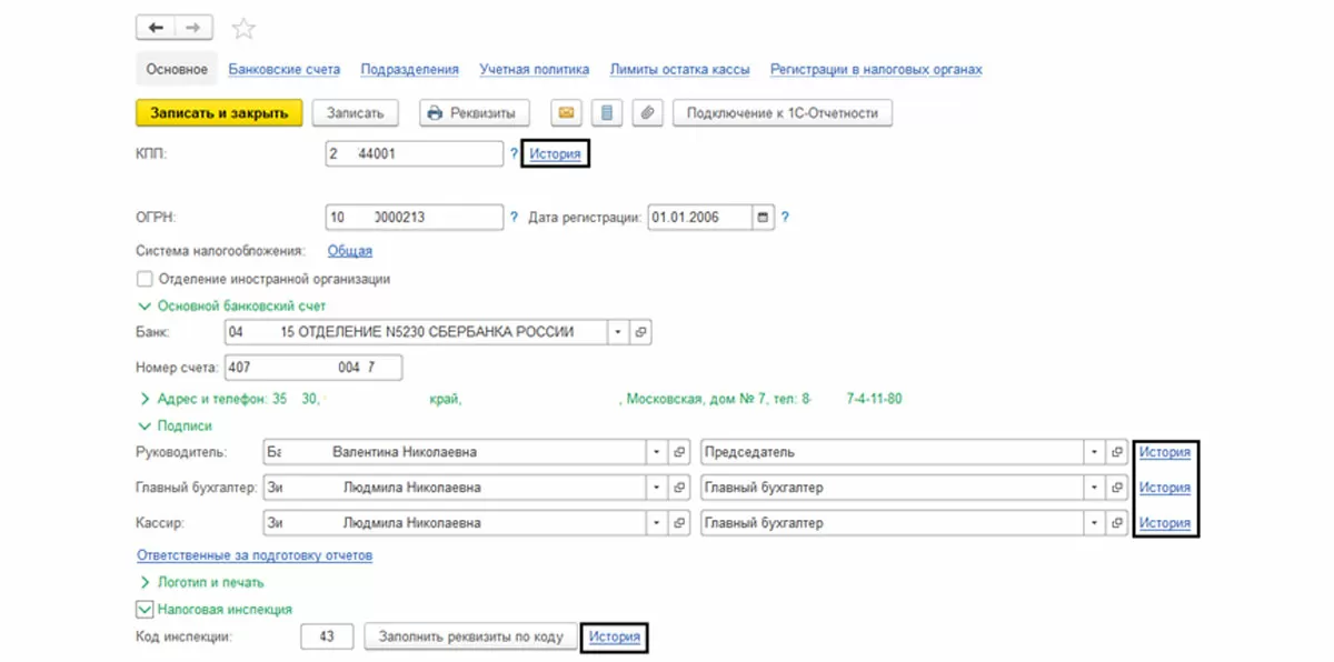 Обратите внимание, что у этих реквизитов есть гиперссылка «История изменений», и точное их отражение будет влиять на правильность учета в программе.