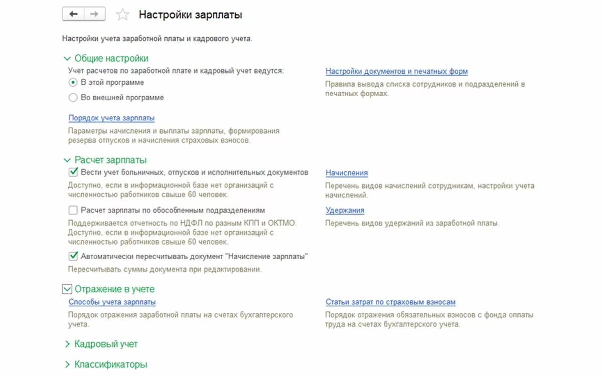 Перейдя в один из разделов (в нашем примере «Настройки зарплаты»), мы видим настройки этого раздела, которые выполняются установкой переключателя, галочки, а также ссылки на другие разделы, чтобы осуществить заполнение констант в 1С.