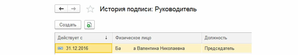 Например, значение реквизита «Подписи» – «Руководитель» действует с 31.12.2016 года. И при изменении этого реквизита (константы), эти данные будут отражены в истории.