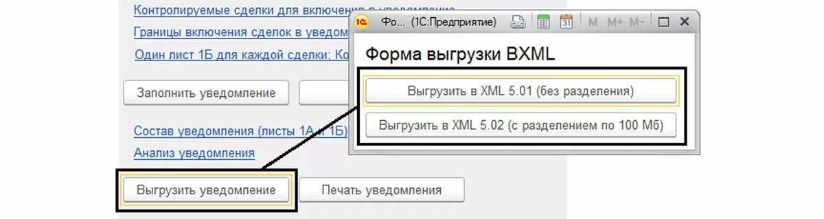 Уведомление может быть передано в ИФНС как в бумажном, так и электронном виде. «Помощник» предусматривает его выгрузку, но если у компании большое количество сделок, то будет сформировано много листов А и Б, то есть файл будет большого объема. Поэтому есть варианты выгрузки в XML – без разделения и с разделением по 100 Мб. Жмем «Выгрузить в XML» (выбранный вариант) и получаем файл для передачи в налоговую, в соответствии с утвержденным форматом.