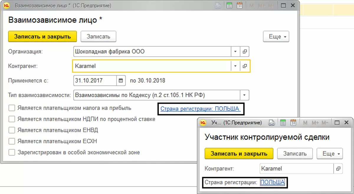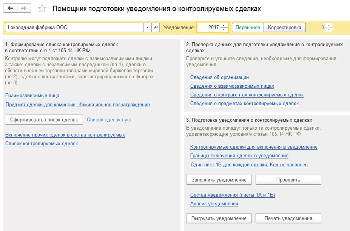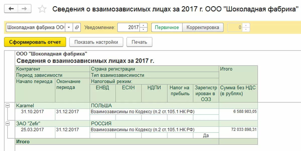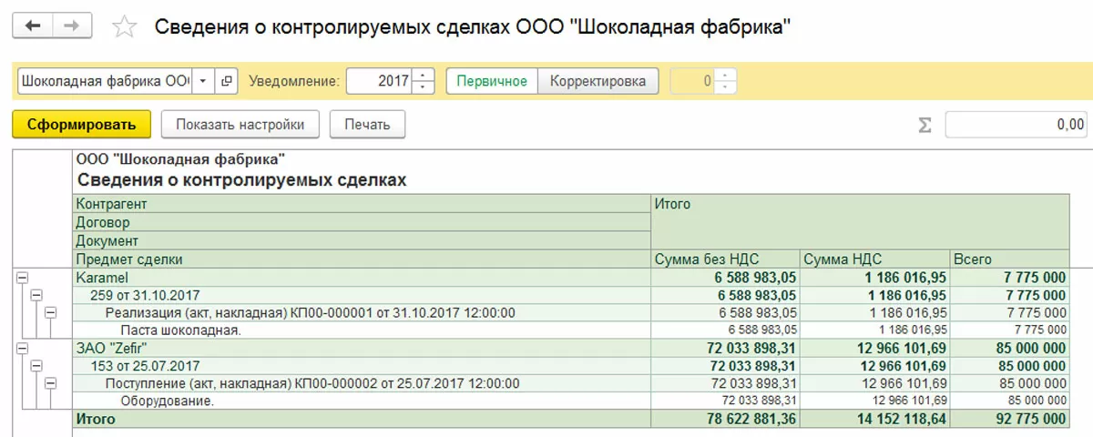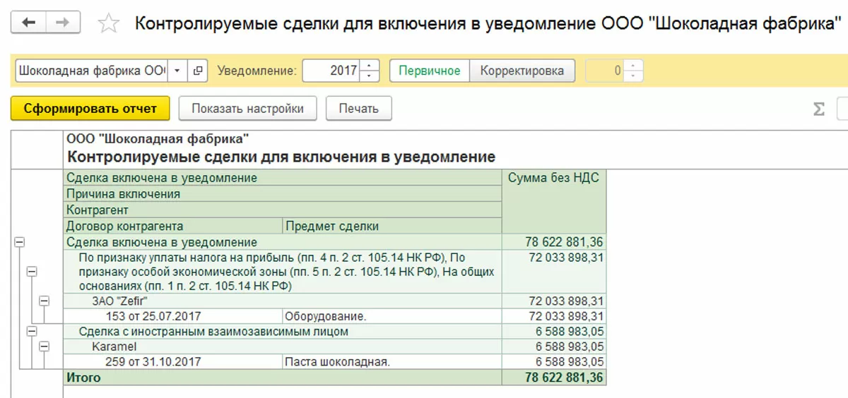 ООО «Шоколадная фабрика» закупила в 2017 году у ЗАО «Zefir» оборудование. Также, компанией ООО «Шоколадная фабрика» была реализована в 2017 продукция взаимозависимой фирмы «Karamel». Данные операции отражены в программе.