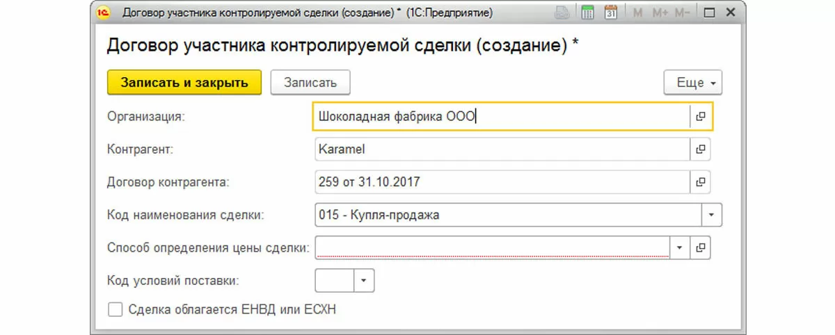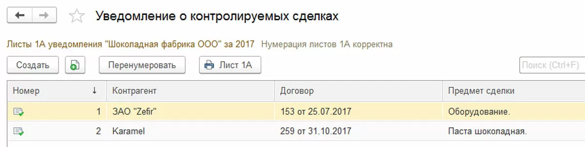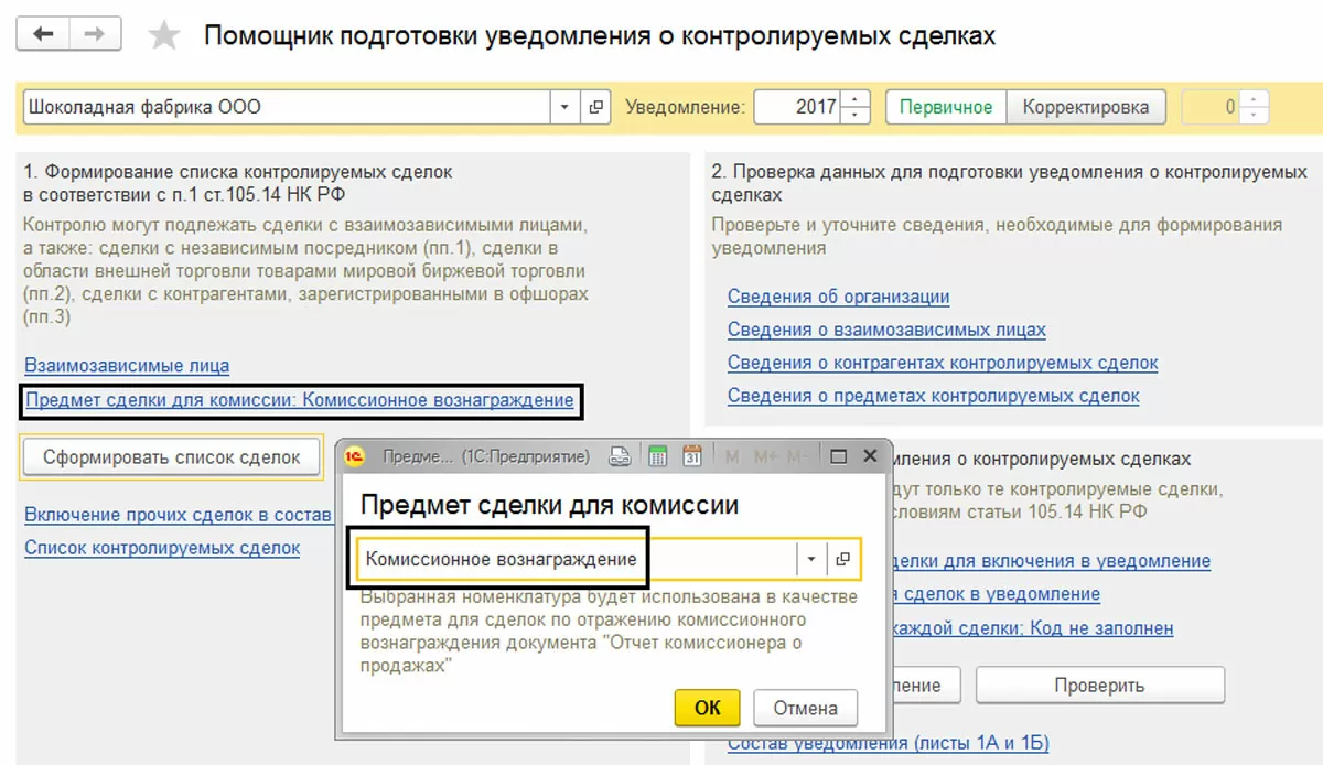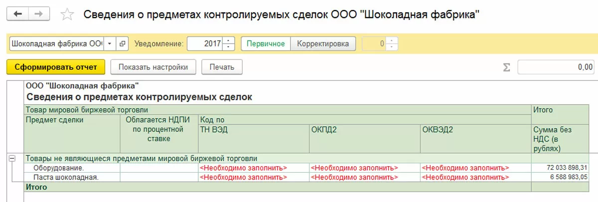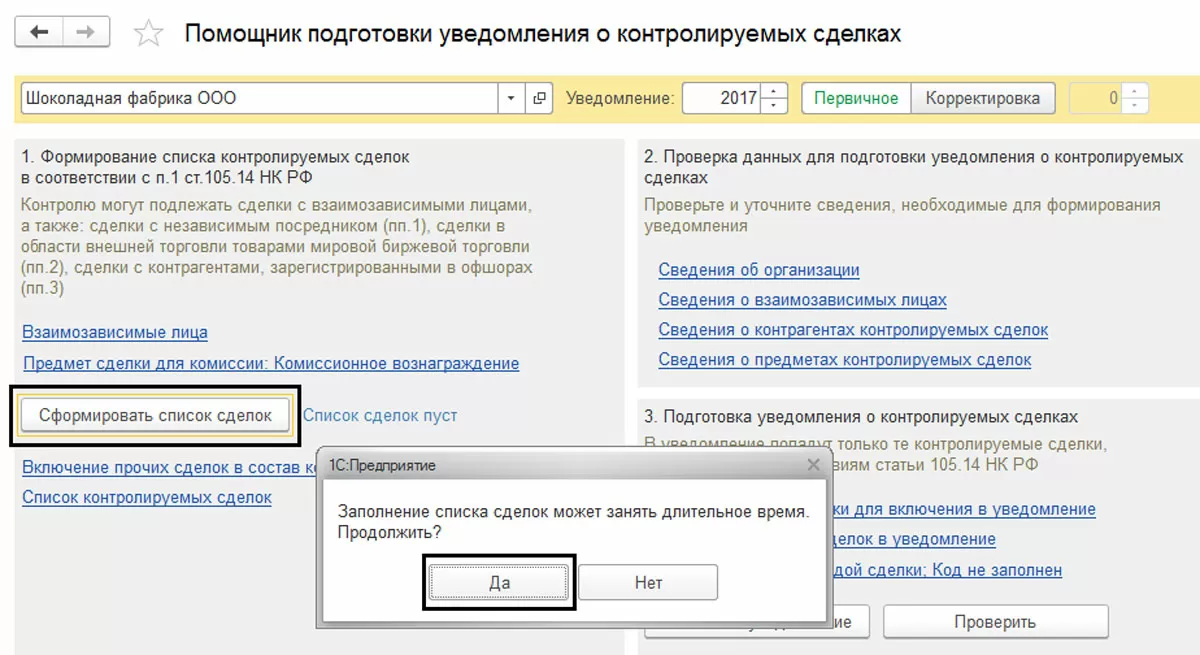 ООО «Шоколадная фабрика» закупила в 2017 году у ЗАО «Zefir» оборудование. Также, компанией ООО «Шоколадная фабрика» была реализована в 2017 продукция взаимозависимой фирмы «Karamel». Данные операции отражены в программе.