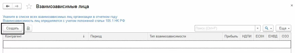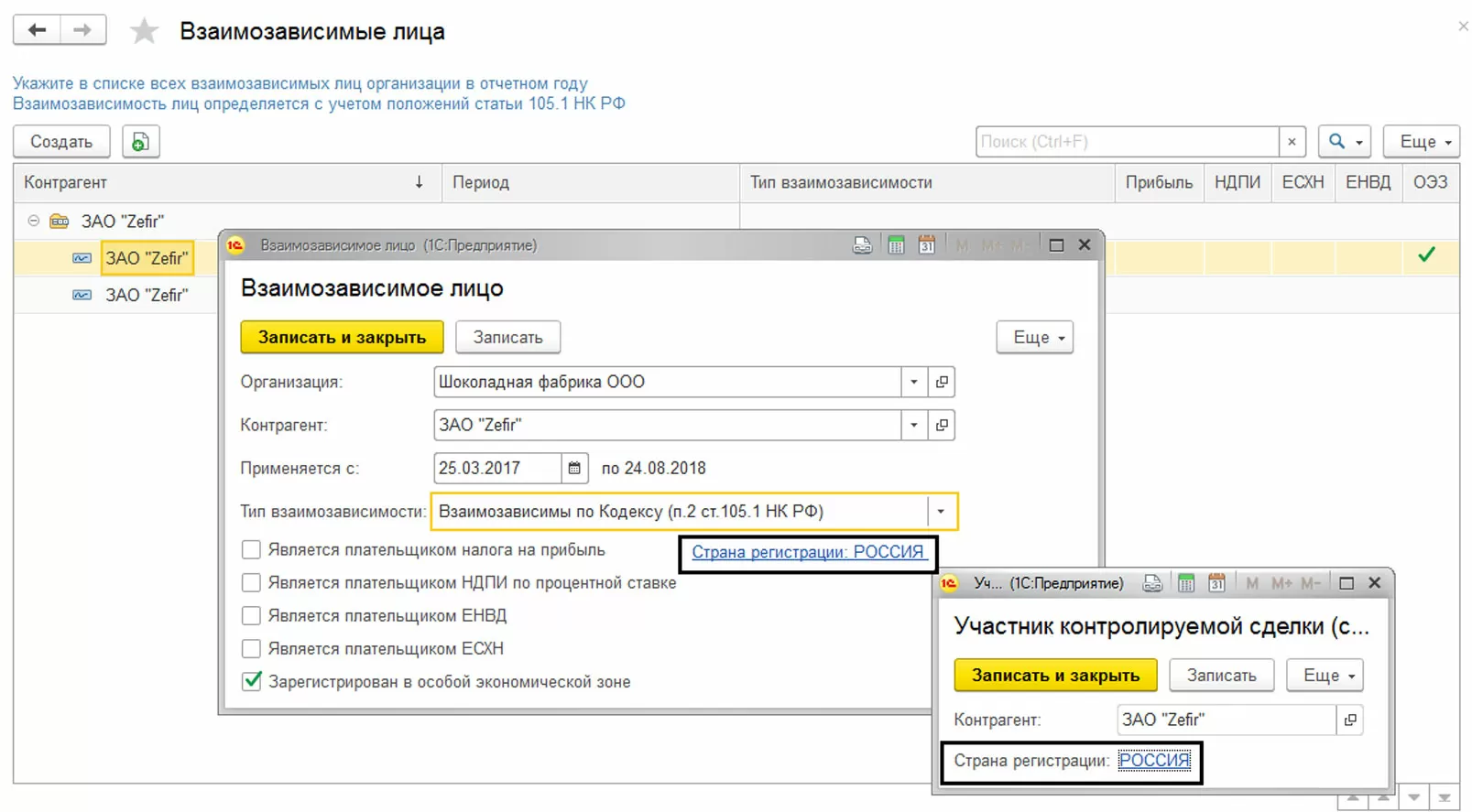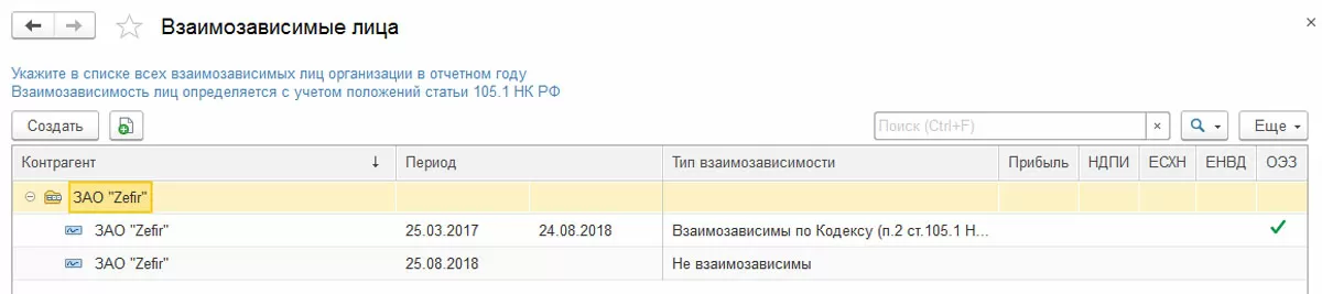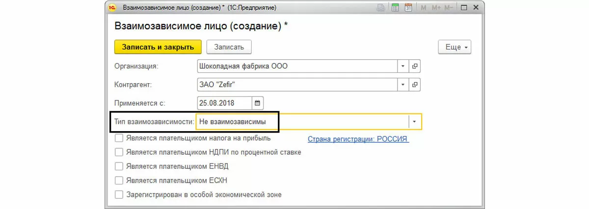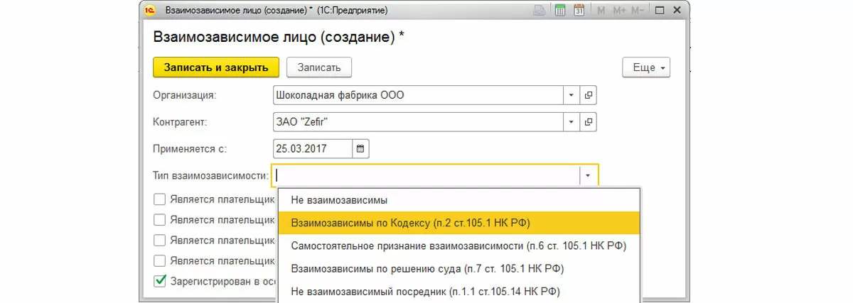 Зависимость задается на конкретный период, то есть в системе можно прописать, что, например, ЗАО «Zefir» было взаимозависимо с ООО «Шоколадная фабрика» в 2017, а с середины 2018 уже не таковым не являлось. Поэтому в нашем справочнике мы создаем 2 записи для ЗАО «Zefir», в одной из которых указываем дату применения и нужный тип зависимости, а во второй – дату окончания договора и тип «Не взаимозависимы».