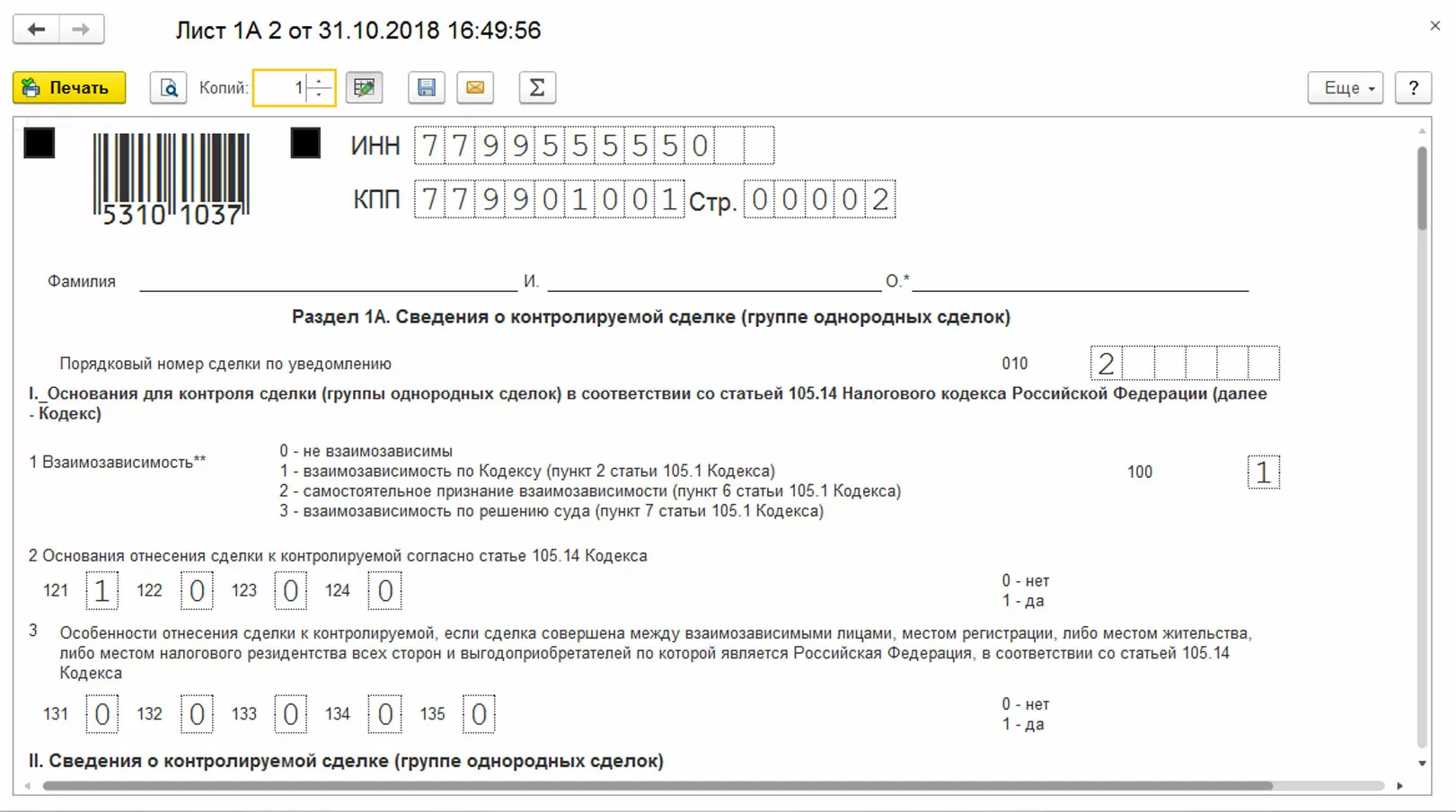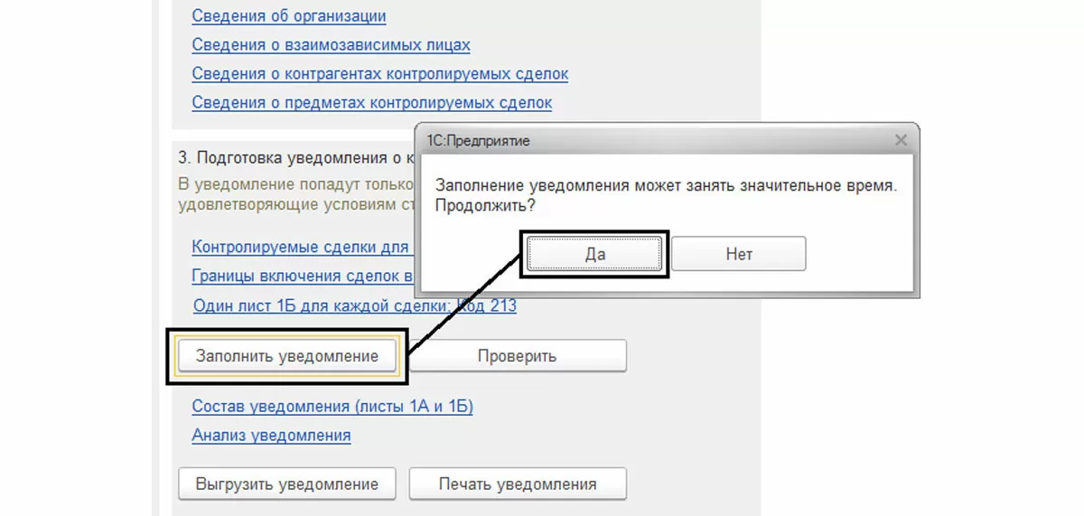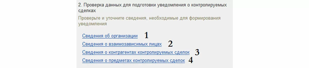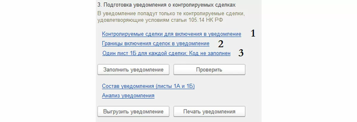 Перейдя по гиперссылке 1, можно создать отчет о контролируемых сделках в 1С, включенных в уведомление.