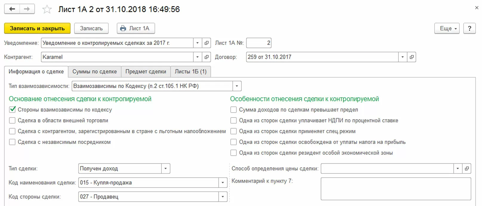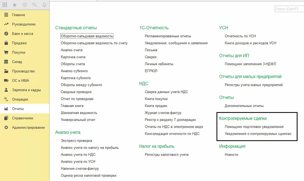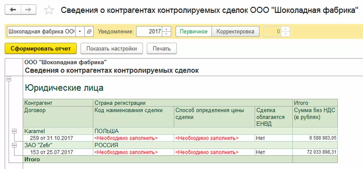 Рассмотрим пример формирования отчета «Сведения о контролируемых сделках» в программе 1С для автоматизации бухгалтерского учета.