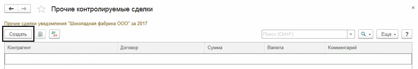 Если имели место какие-либо еще сделки, удовлетворяющие критериям подконтрольных, их нужно внести в список через раздел «Прочих». Создаем и заполняем документ, который предназначен для регистрации произвольных подконтрольных сделок, которые не зарегистрированы автоматом в базе, например, при отражении вручную документом «Операции (бухгалтерский и налоговый учет)».