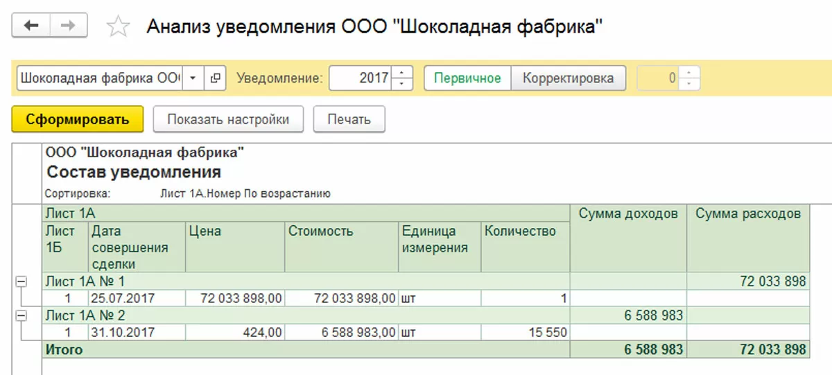 Рассмотрим создание уведомления на примере условной организации ООО «Шоколадная фабрика» в бухгалтерской программе 1С.