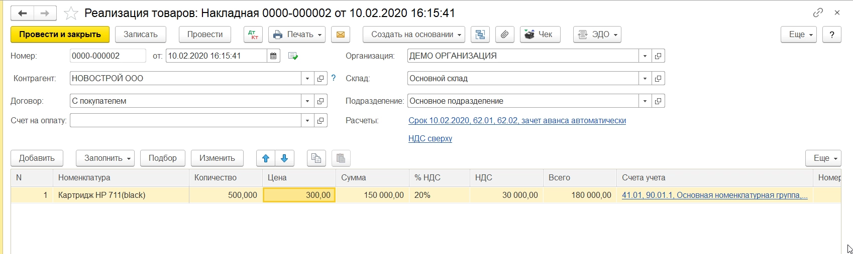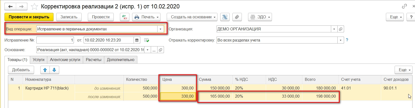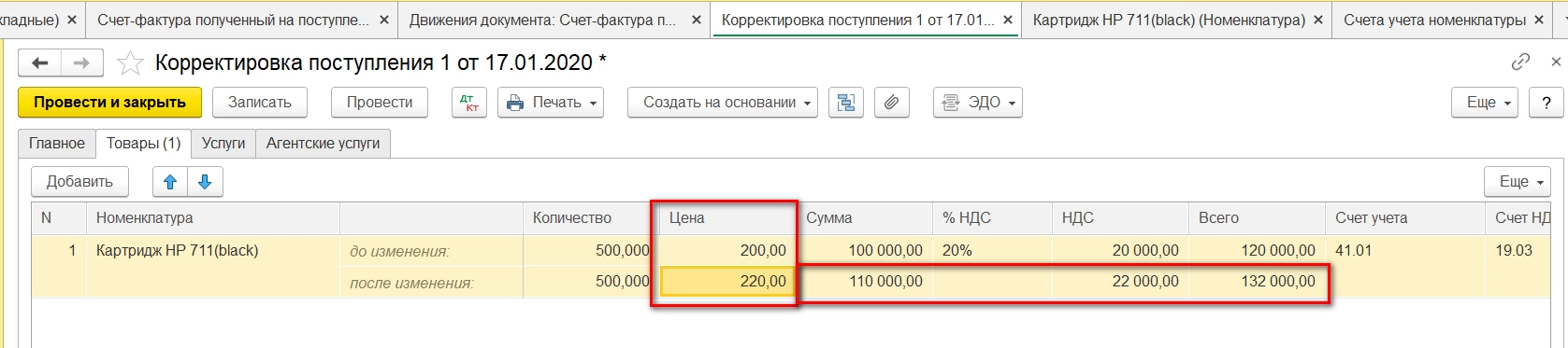 Заполняем табличную часть вкладки «Товары». Увеличиваем цену, остальные суммы пересчитаются автоматически.