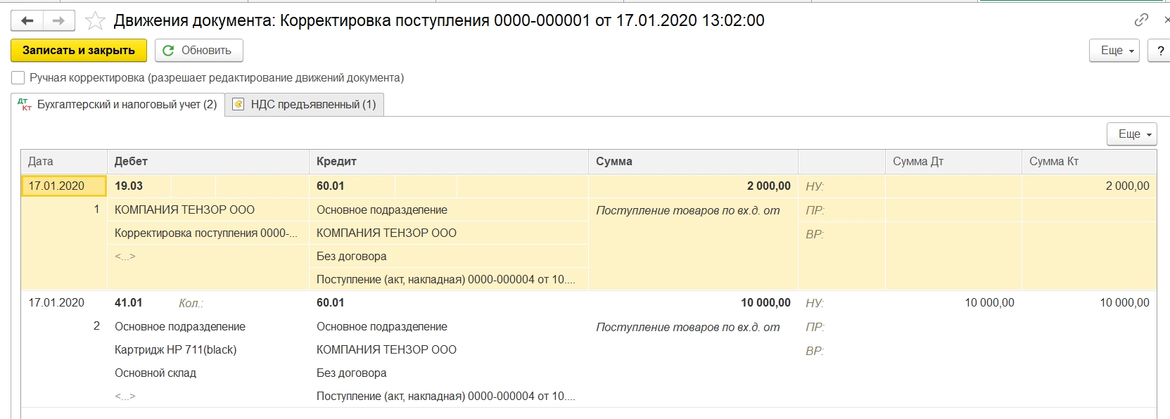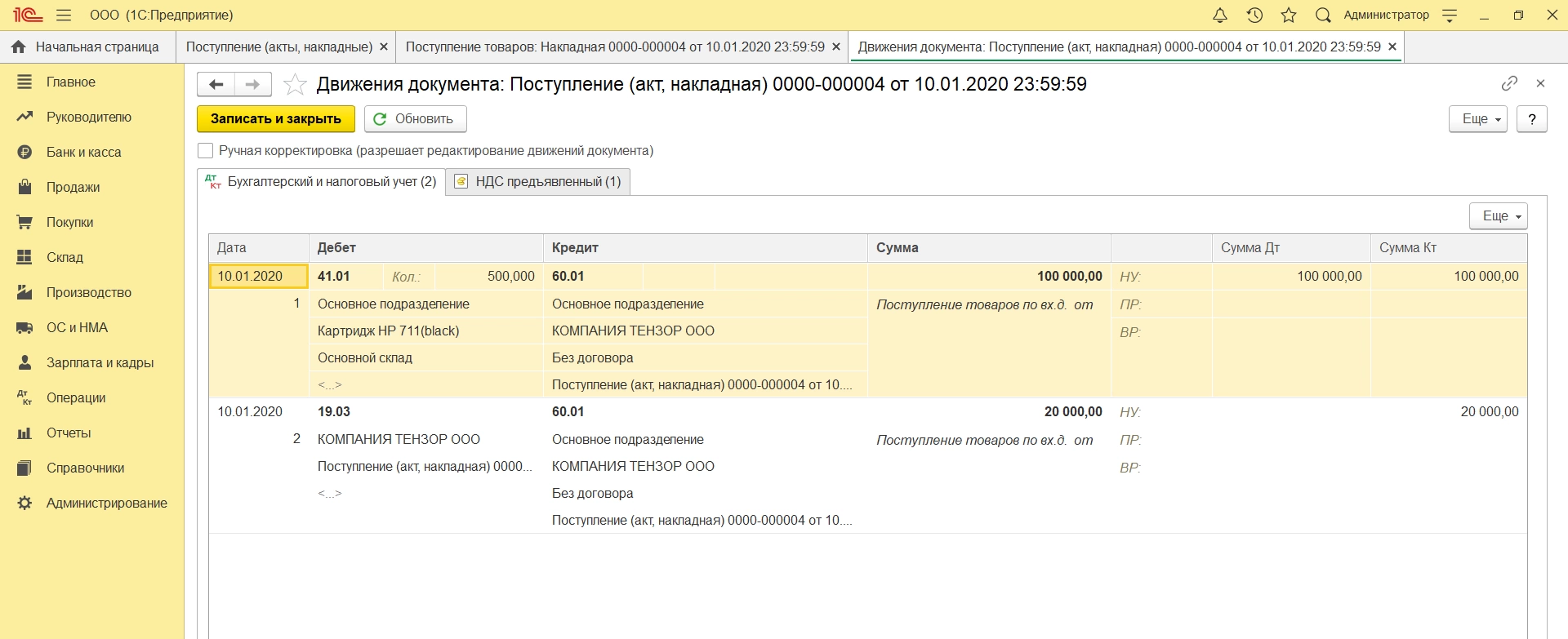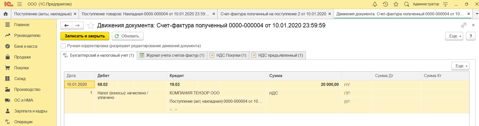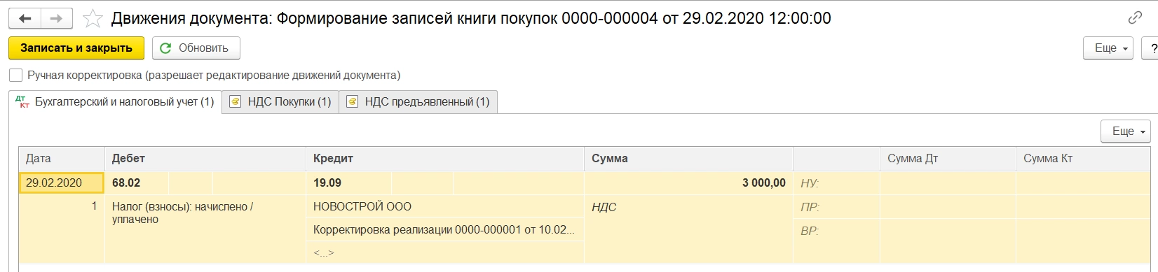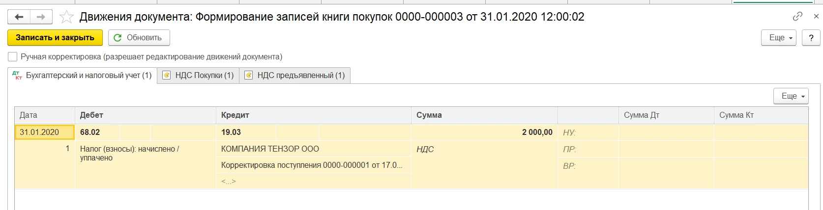 В документе формируются проводки и записи по регистрам НДС, на основании которых можем сформировать книгу покупок.