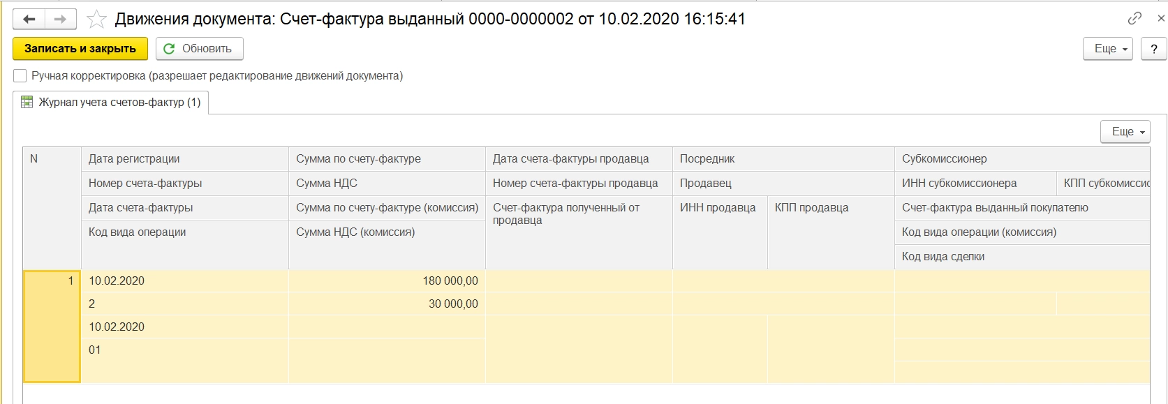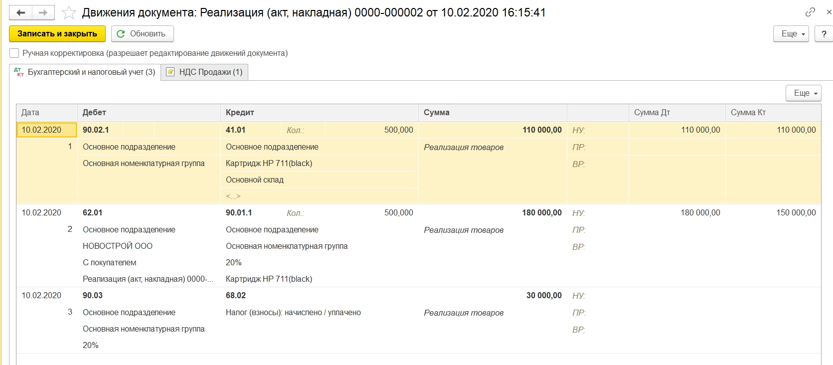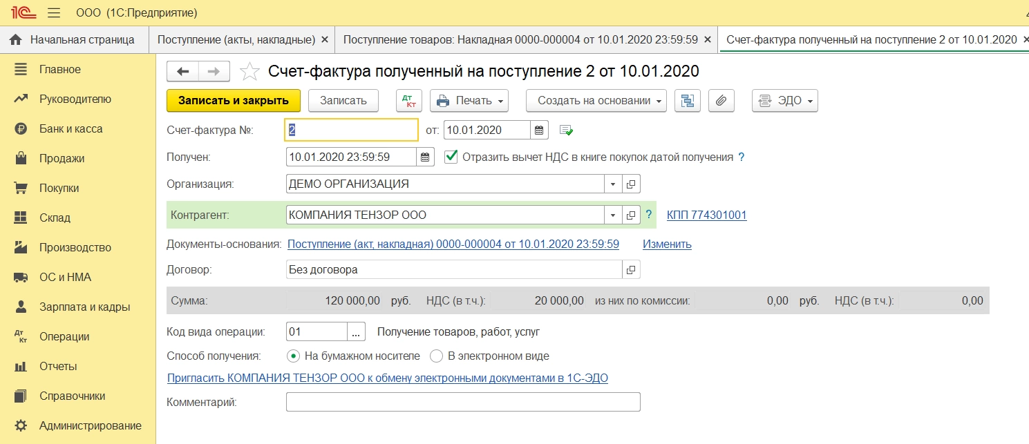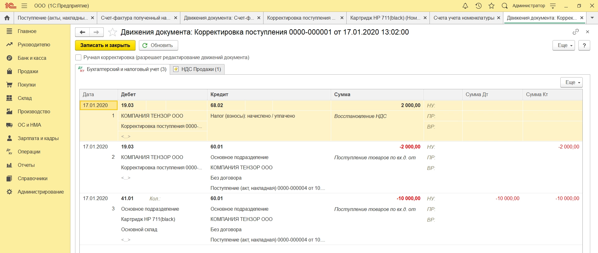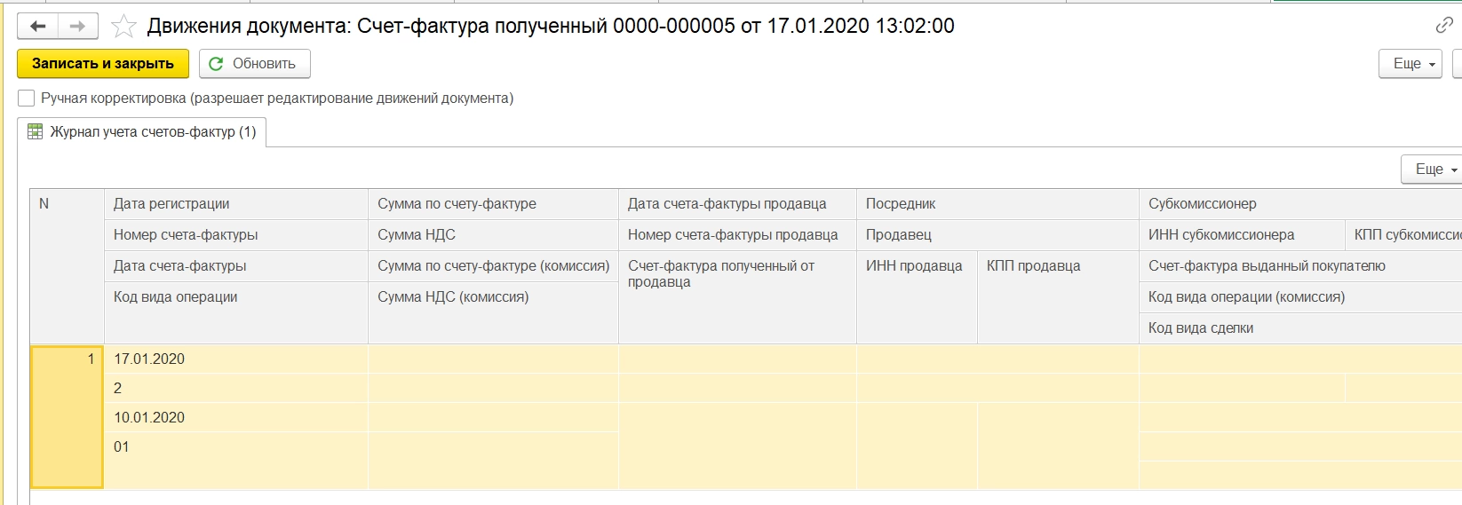 В документе формируются проводки и записи по регистрам НДС, на основании которых можем сформировать книгу покупок.