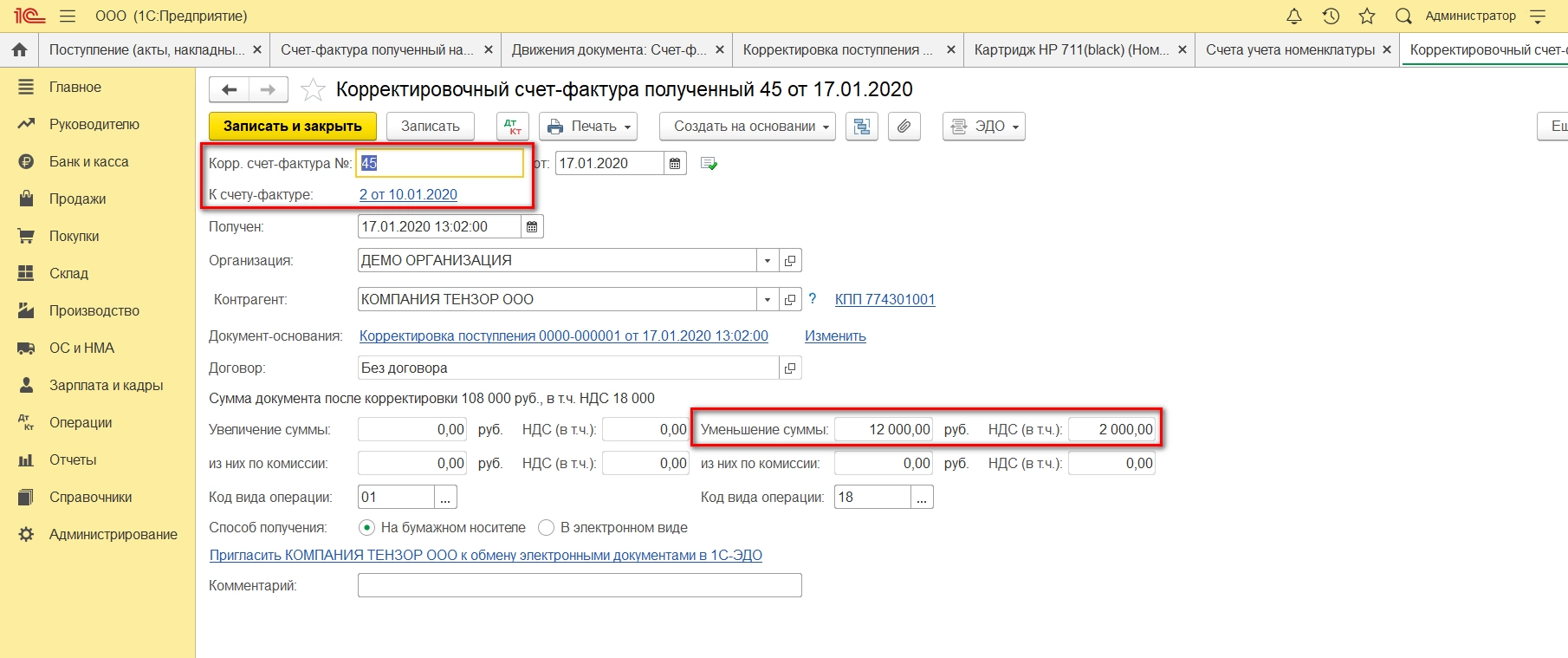 Здесь возможны два варианта: использование «Корректировочного счета-фактуры» (КСФ) или исправление ошибочно введенных данных. Во многом действия пользователей в этих случаях схожи, но мы подробно рассмотрим работу в 1С с КСФ, а также и то, как отразить прямое исправление ошибок по НДС.