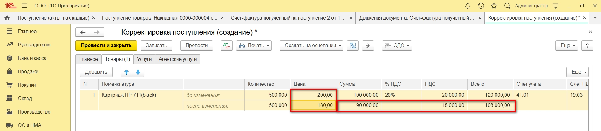Изменим условие: теперь надо увеличить стоимость поступления. Алгоритм действий во многом похож, только данные отражаются в книге покупок. Соответственно убираем галочку на отражение корректировки в книге продаж.