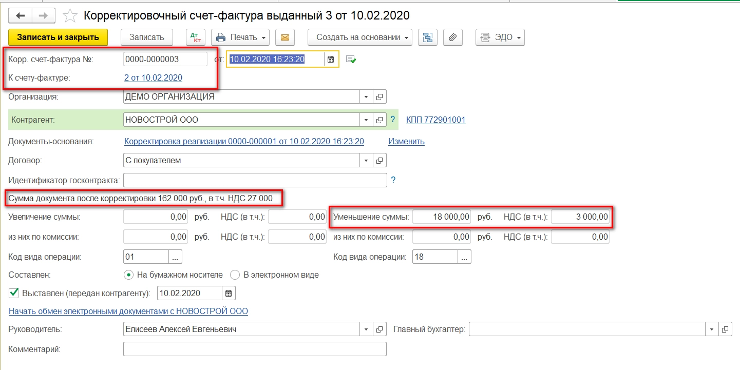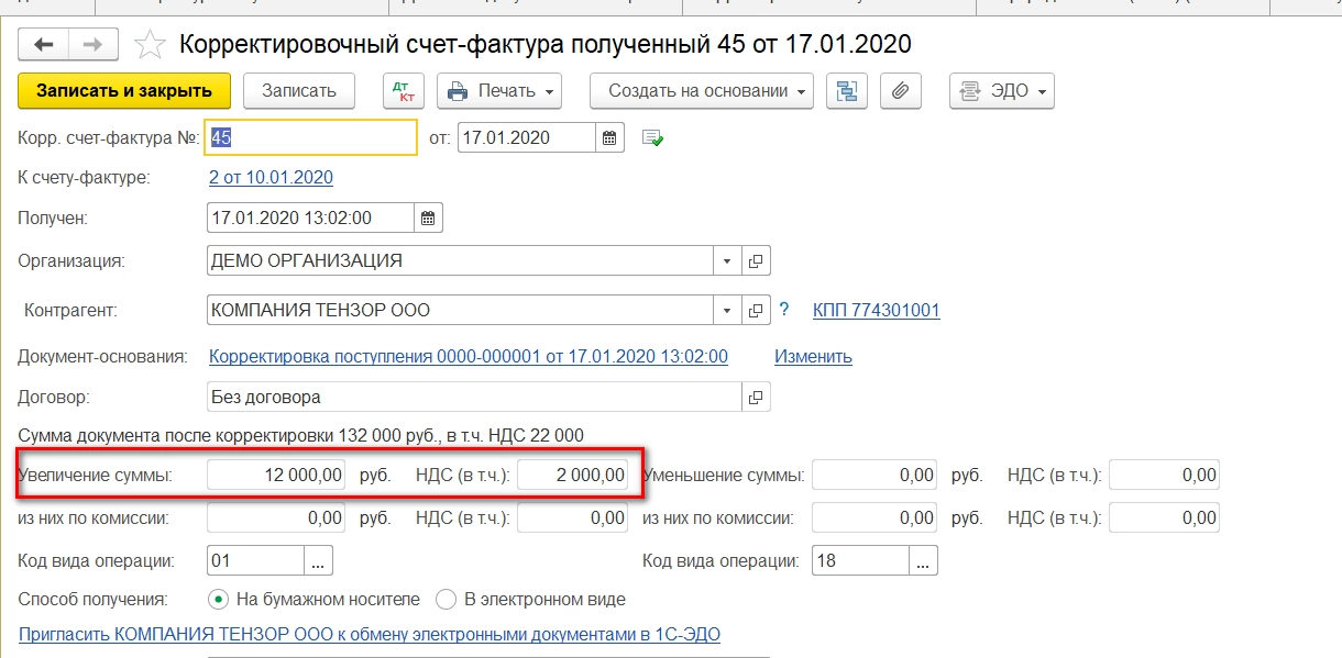 Следующий вариант корректировки – продавец увеличил стоимость. Алгоритм во многом схож, КСФ отражаем в книге продаж.