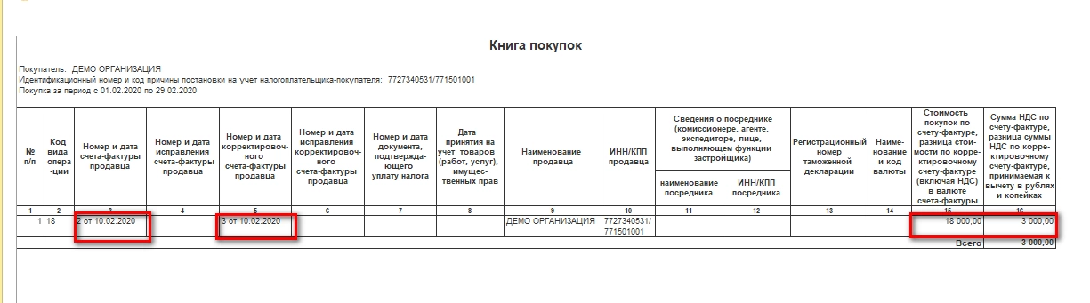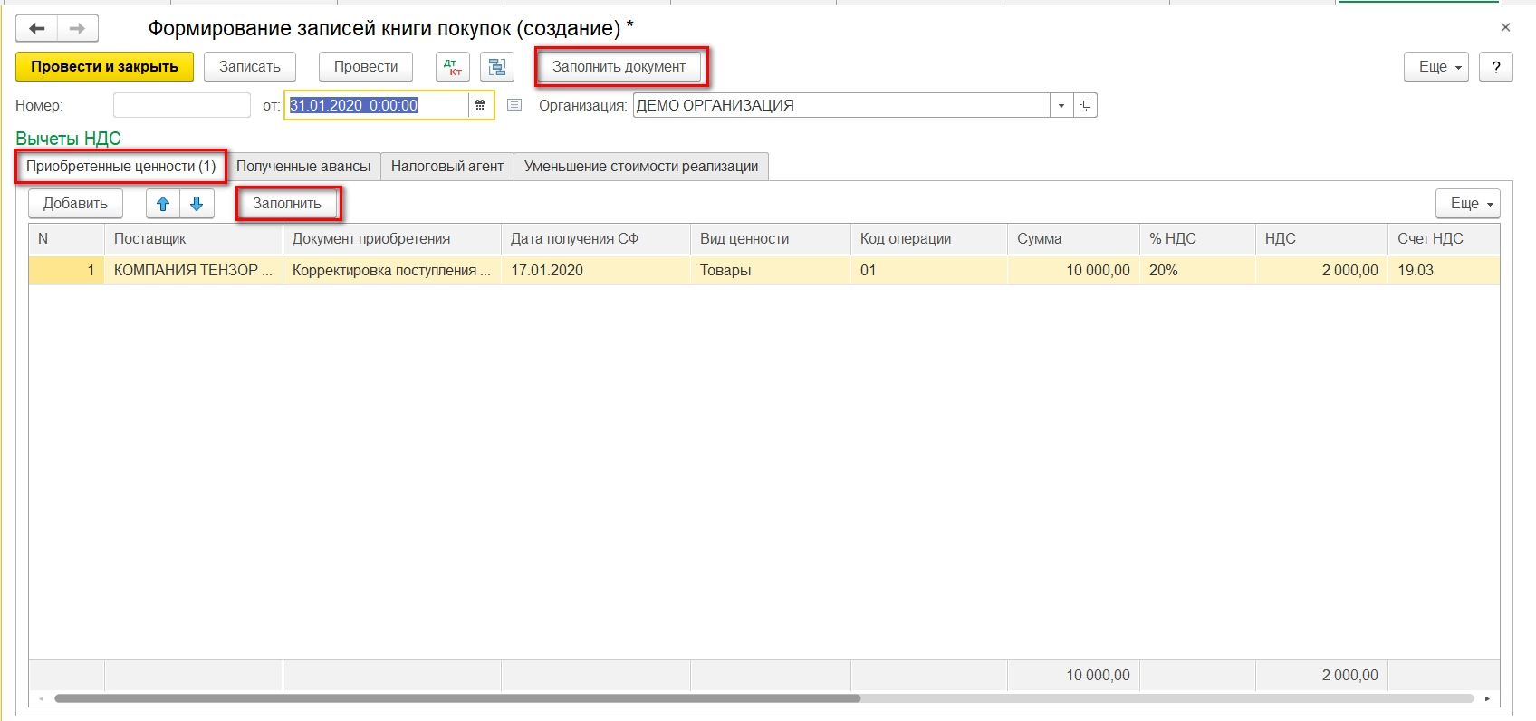 Для отражения данных в книге покупок заполняем документ «Формирование записей книги покупок». Он формируется автоматически по кнопке «Заполнить документ». В документе несколько вкладок, наша корректировка отражается на вкладке «Приобретенные ценности».