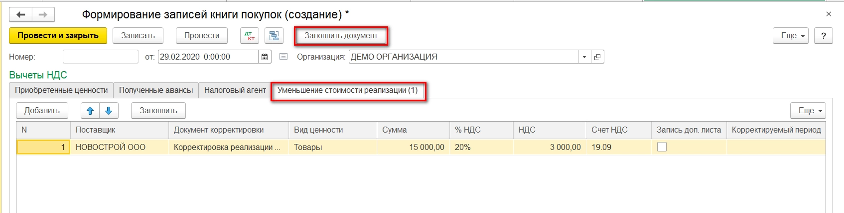 Далее для отражения в регламентированной отчетности корректировки следует сформировать записи книги покупок. Кнопка «Заполнить документ» автоматически их формирует, данные из примера отображаются на вкладке, посвященной уменьшению стоимости реализации.