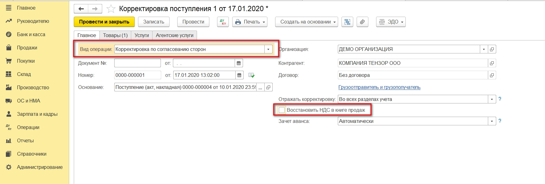 На вкладке «Главное» оставляем установку «Восстановить НДС в книге продаж». Кроме того, можем по ситуации менять варианты, где отражать корректировку – во всех разделах учета или только по НДС. Мы выбрали первый вариант, тогда формируются бухгалтерские проводки.