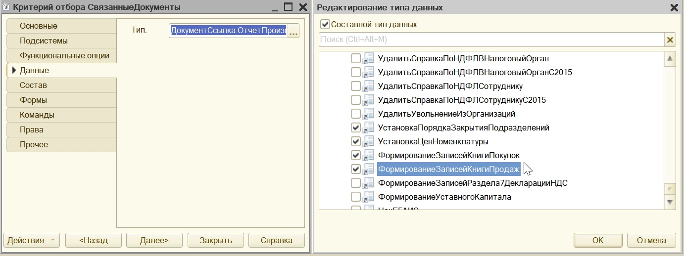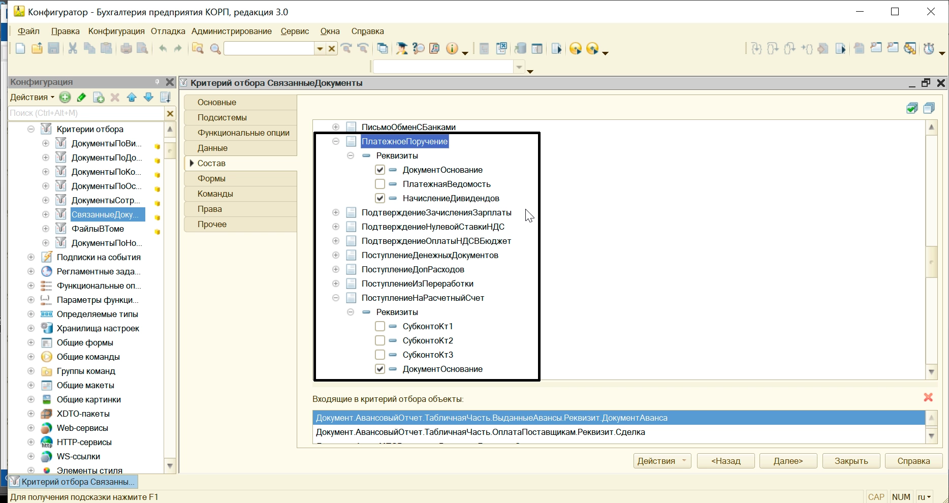 Для того чтобы эту связь увидел пользователь, в настройках критерия отбора «СвязанныеДокументы» (на закладке «Данные») определяется список возможных связанных документов, а в «Составе» – тех, которые могут служить основанием для других документов.