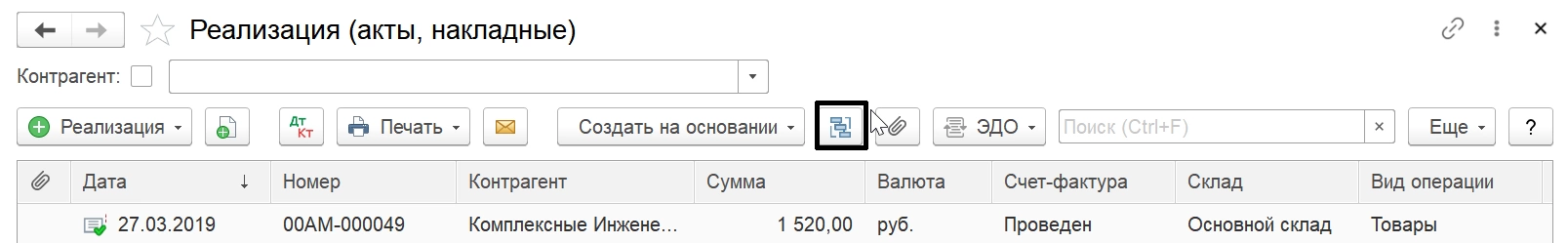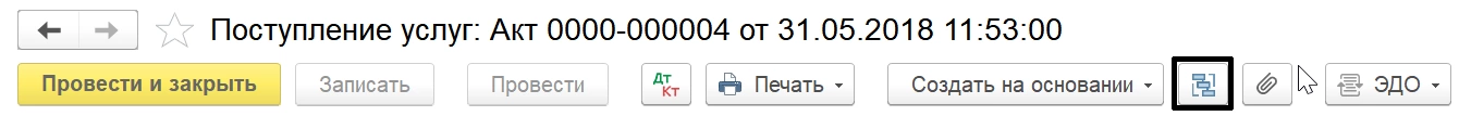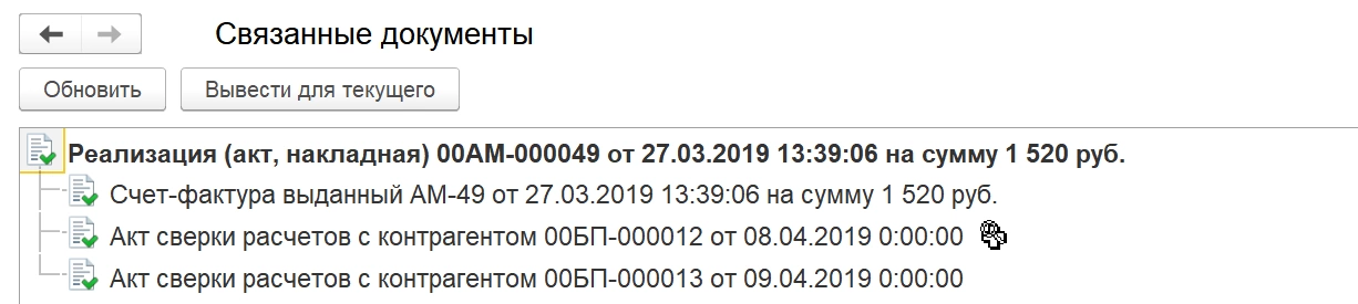 По такому же принципу в программах 1С реализована возможность создавать документы на основании других. Между ними образуется связь, и пользователь может увидеть связанные документы, нажав на кнопку на панели инструментов «Перейти к иерархическому списку связанных документов».