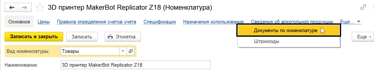 Далее выполняем команду «Обновить конфигурацию базу данных» (пункт меню «Конфигурация») и проверяем наш результат. Откроем любой элемент справочника «Номенклатура» и, нажав на гиперссылку «Еще», мы увидим пункт «Документы по номенклатуре».