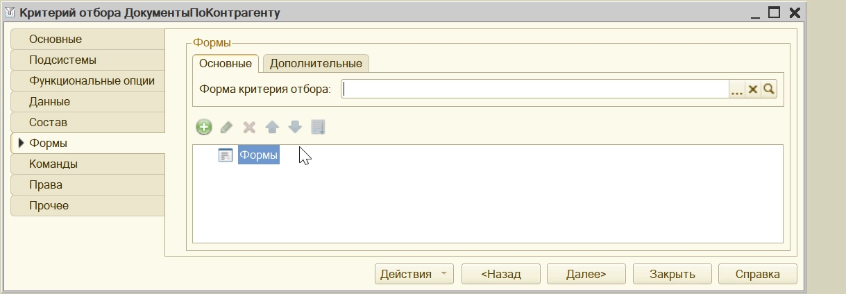 Критериев отбора можно создавать множество, но для работы с ними нужно создавать формы, которые можно размещать и на панели инструментов, и в пользовательском меню. Критерии будут доступны по кнопке «Еще» во всех отмеченных объектах.