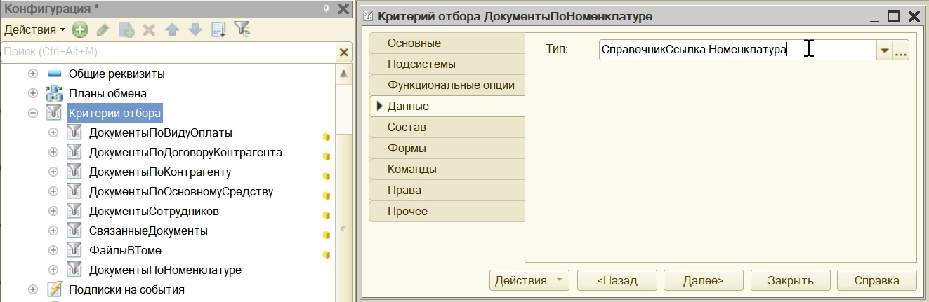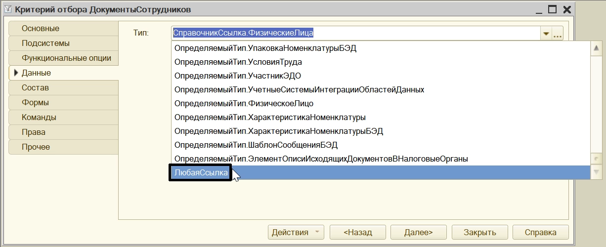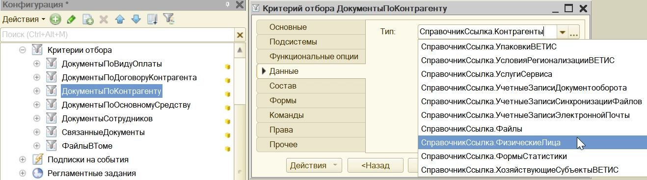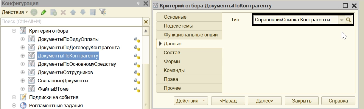 В «Данных» задается «Тип» – это тип значения для отбора, по которому и будет осуществляться поиск. К примеру, «ДокументыПоКонтрагенту» имеет тип СправочникСсылка.Контрагенты, а «ДокументыСотрудников», имеют тип СправочникСсылка.ФизическиеЛица.
