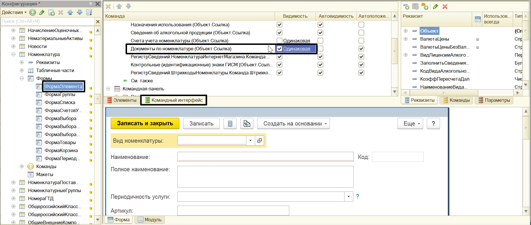 Чтобы в режиме «1С:Предприятие» наше новшество работало, его необходимо включить в интерфейс пользователя, где мы хотим его видеть. Найдем в дереве метаданных справочник «Номенклатура», откроем ее форму элемента. На закладке «Командный интерфейс», прокрутив вниз, в разделе «Перейти» мы видим строку «Документы по номенклатуре (Объект.Ссылка)». Установим там галочку.