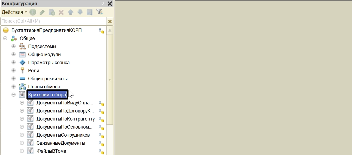 Откроем программу в режиме «Конфигуратор» и, сделав это, найдем в дереве метаданных нужный раздел критериев.