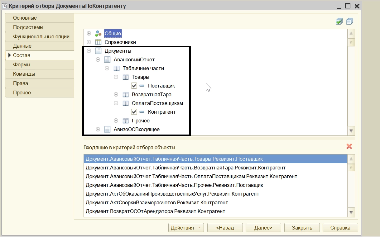 На закладке «Состав» отображаются те элементы, в которых содержатся данные указанного типа. В этом окне необходимо установить галочки для тех элементов, по которым будет осуществляться отбор. Только после определения этого списка, критерий отбора будет выполнять свою функцию.