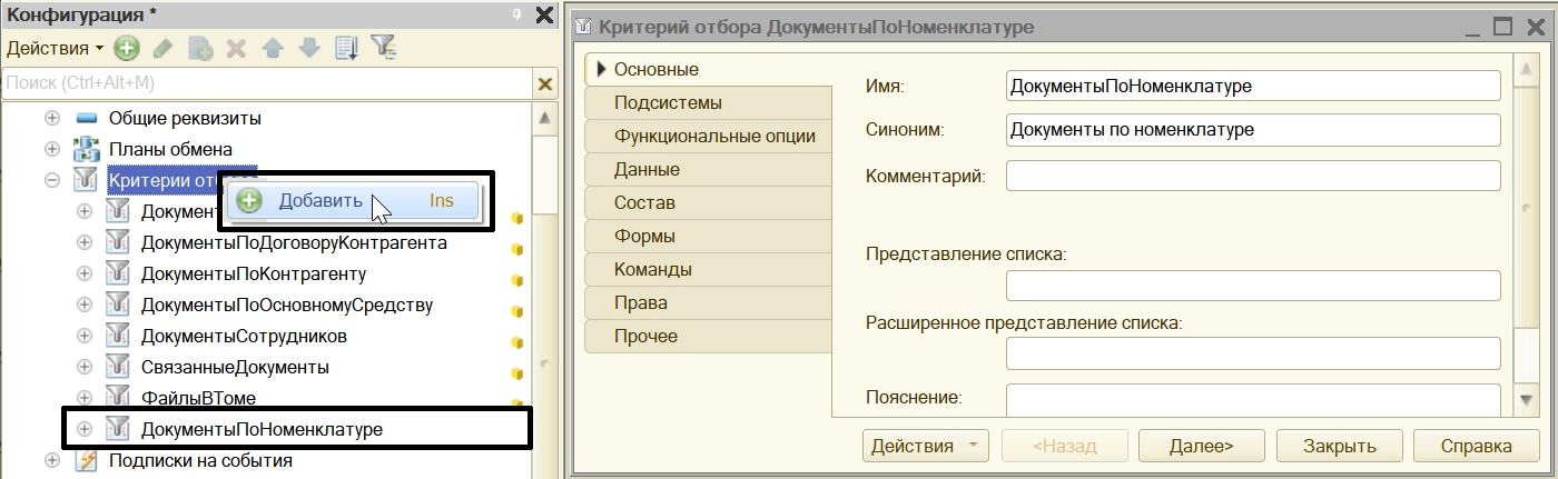 Создадим «ДокументыПоНоменклатуре», нажав правой кнопкой мышки и выбрав команду «Добавить».
