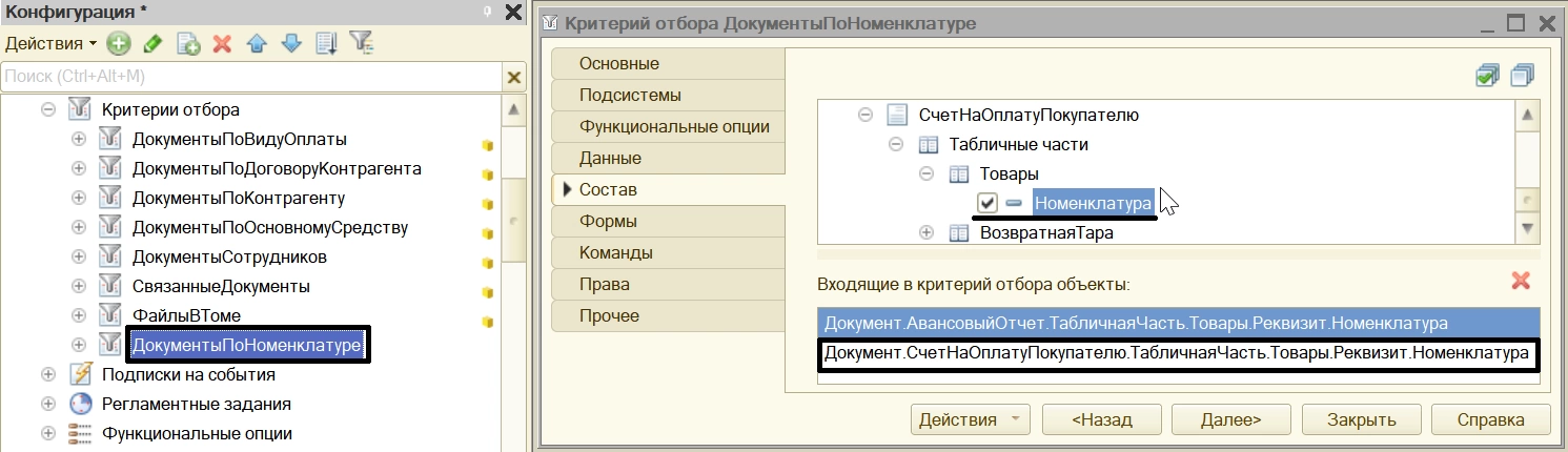 Мы указываем тот тип, по которому будет производиться отбор. Преимущество критерия отбора заключается в том, что он может использовать также реквизиты табличных частей. Так, например, мы можем выбрать все документы с определенной номенклатурой в табличной части.