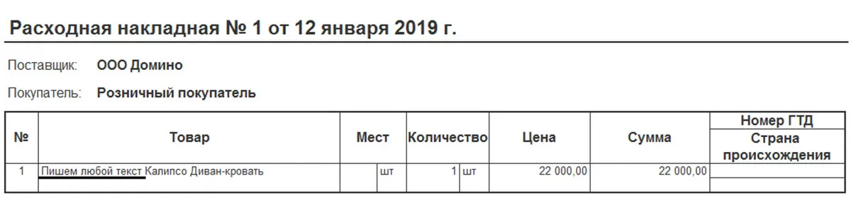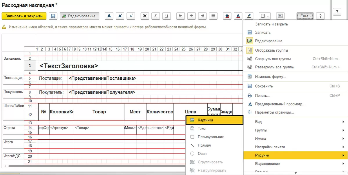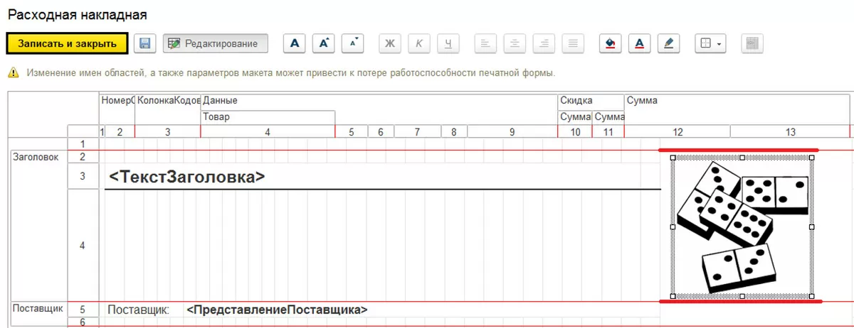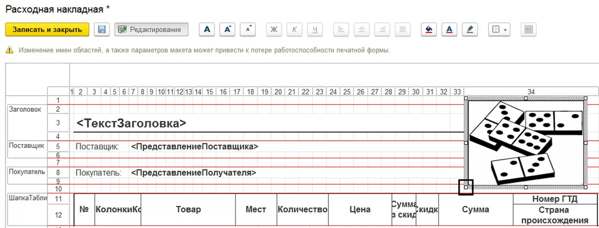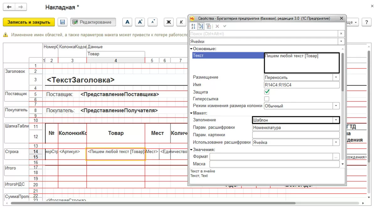 Открываем нашу печатную форму накладной и видим, что в ячейке приписан наш текст.