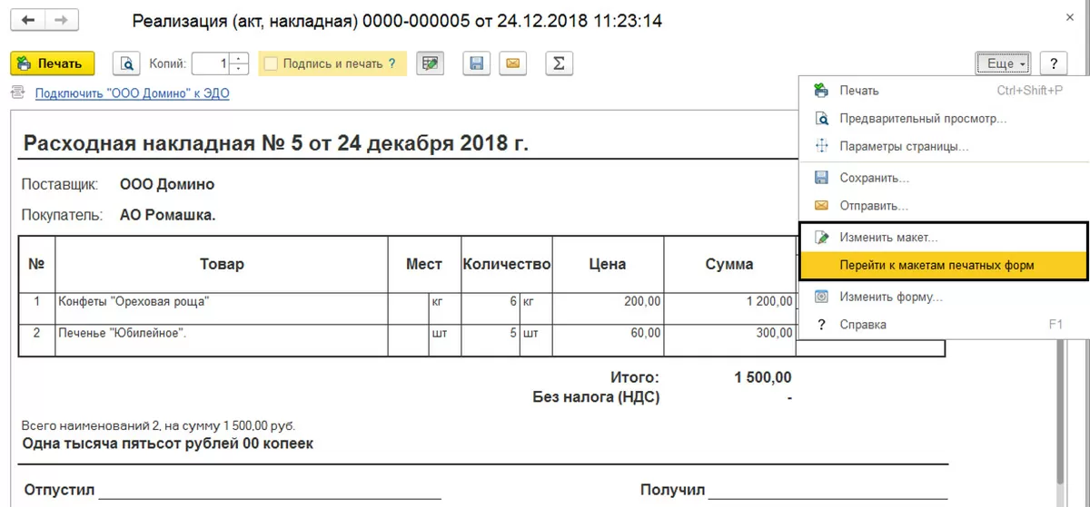 Предположим, мы хотим изменить печатную форму и добавить логотип нашей организации. Кроме утвержденных обязательных реквизитов организация вправе вносить изменения, сохраняя утвержденную форму документа. Логотип не входит в число обязательных реквизитов, но организация имеет право его добавить. Выбрав нужную печатную форму (кнопка «Печать» документа), нажимаем кнопку «Еще». В не мы видим два пункта «Изменить макет» и «Перейти к макетам форм».
