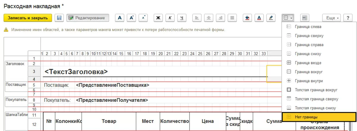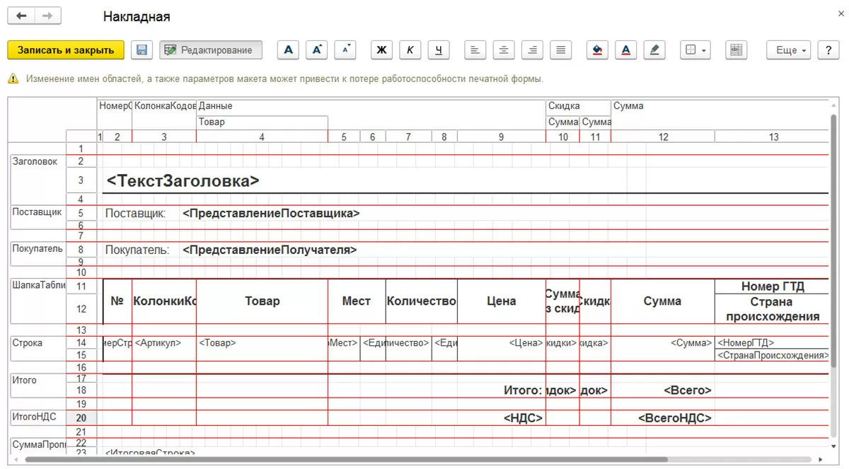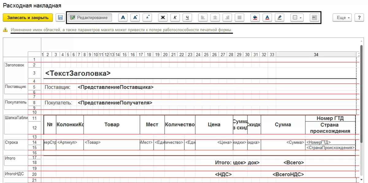Для просмотра и редактирования выберем команду «Изменить макет». Перед нами откроется макет печатной формы, который мы можем редактировать. Как видим, большинство полей формы заданы определенными командами, с помощью которых осуществляется заполнение формы. Разработчик предупреждает, что изменение этих имен областей и параметров, может привести к потере работоспособности печатной формы – изменять их нельзя. Используя кнопки на панели инструментов, мы можем изменить начертание шрифта, выравнивание текста, определить линии границ таблицы и другие изменения внешнего вида формы, которые не повлияют на ее работоспособность. Работа с макетом печатной формы схожа с работой в таблице Excel.