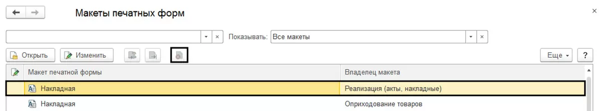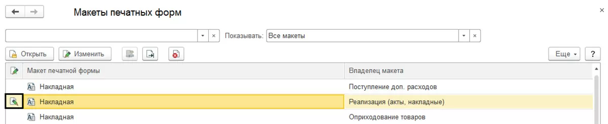 Если мы зайдем в раздел «Перейти к макетам печатных форм» в кнопке «Еще», то увидим, что у измененного нами макета печатной формы сбоку нарисован зеленый карандаш – форма изменена. Если нужно вернуться к исходному макету, то можно нажать кнопку со стрелочкой «Использовать стандартный макет».