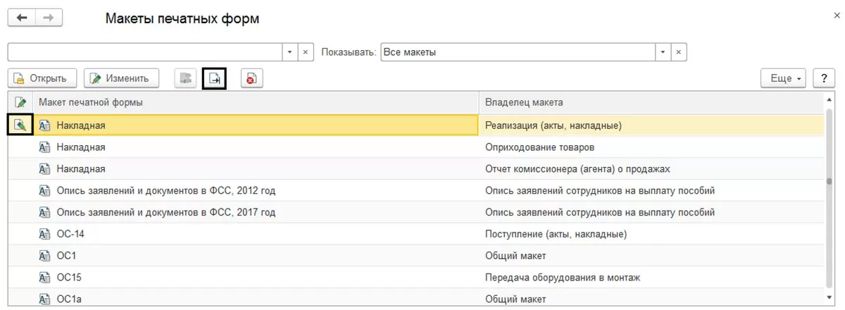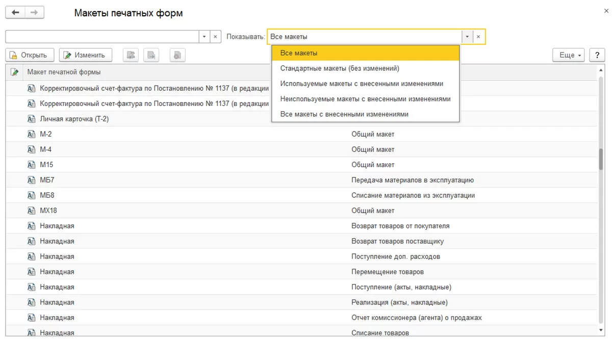 Выбрав команду «Перейти к макетам форм», мы увидим весь перечень макетов печатных форм имеющихся в программе. Для удобства просмотра можно включить отбор – стандартные макеты (без изменений), используемые или неиспользуемые с внесенными изменениями, все макеты с изменениями.