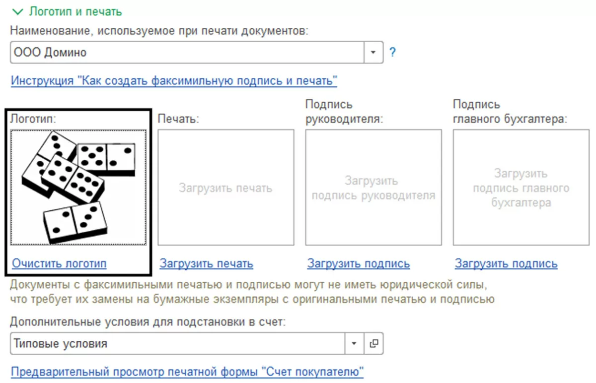 В программе есть и другой способ отображения логотипа в документах, используя настройки организации, но он применим только к печатной форме документа «Счет на оплату». Установив форму логотипа в параметрах организации («Главное» - «Настройки» - «Организации») в разделе «Логотип и печать», он будет отображаться в документе «Счет на оплату».