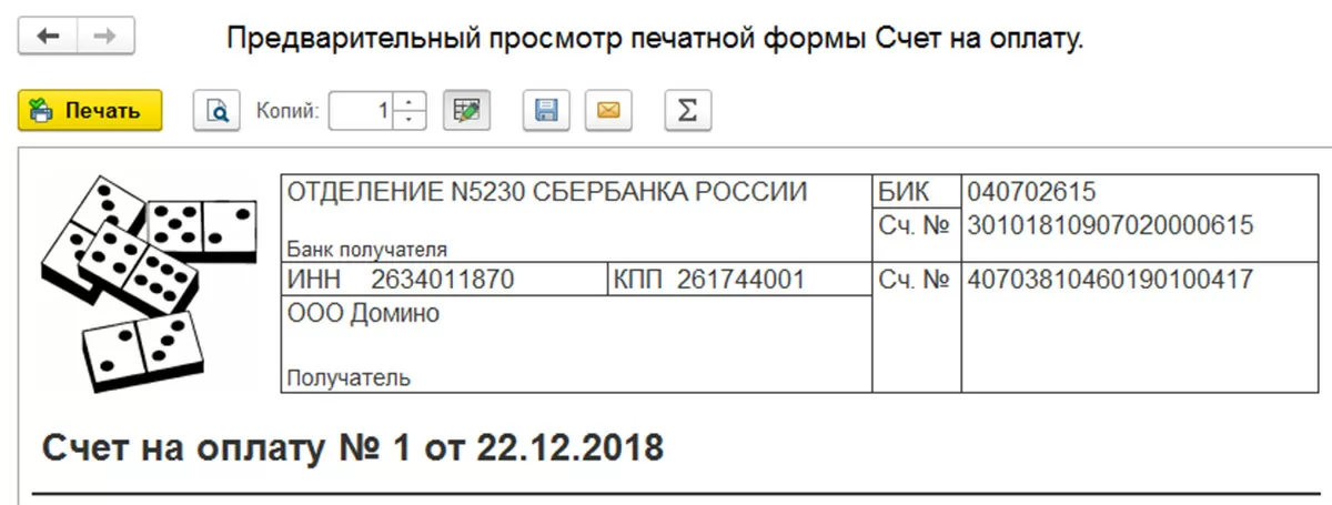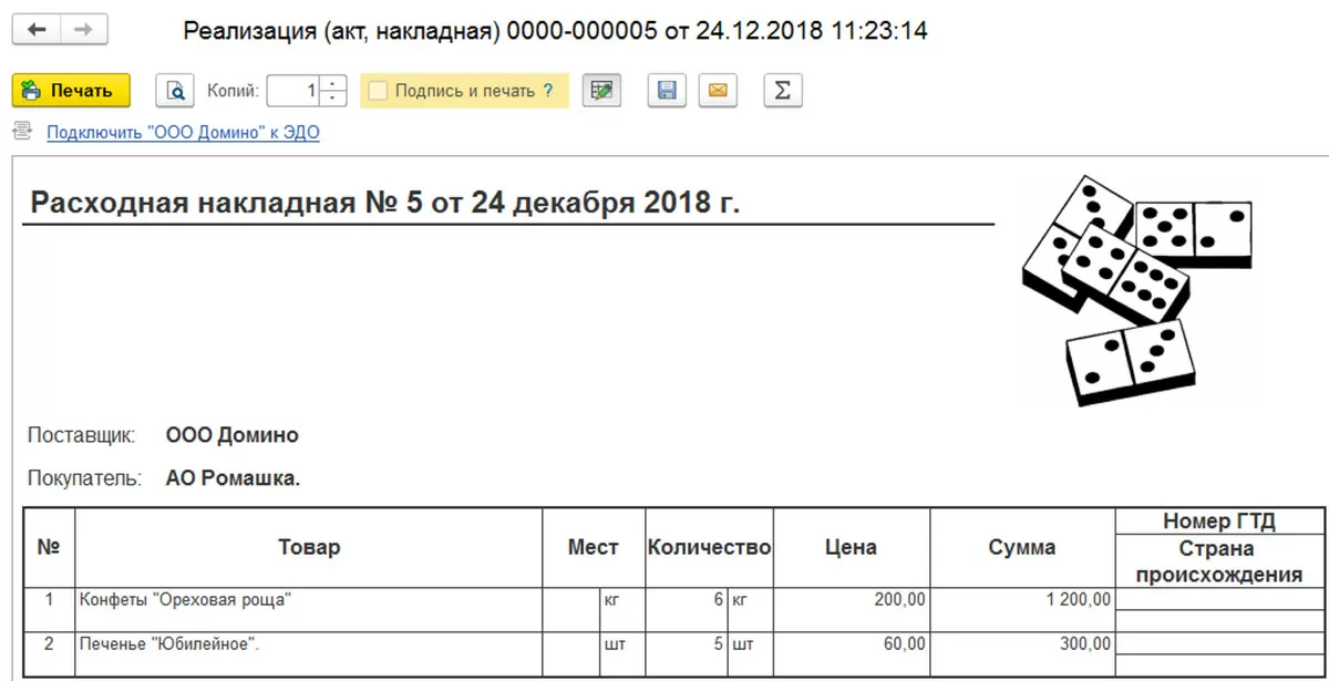 Создадим для примера документ «Реализация (акт, накладная)» (раздел меню «Продажи») и посмотрим печатную форму накладной.