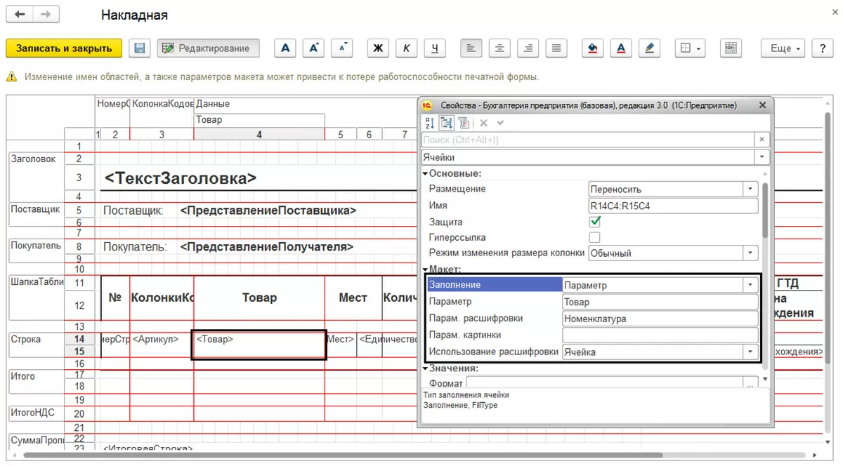 Так, пользователь сам может добавить в макет документа какие-то значения, используя параметры. Чтобы сориентироваться в параметрах, можно просто просмотреть макеты других документов. Например, чтобы в ячейку выводился артикул, товар или цена, достаточно указать название этого параметра в ячейке.