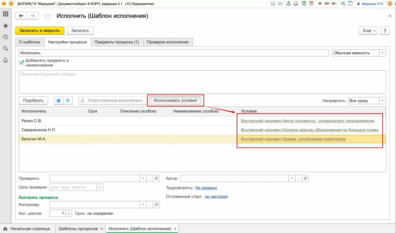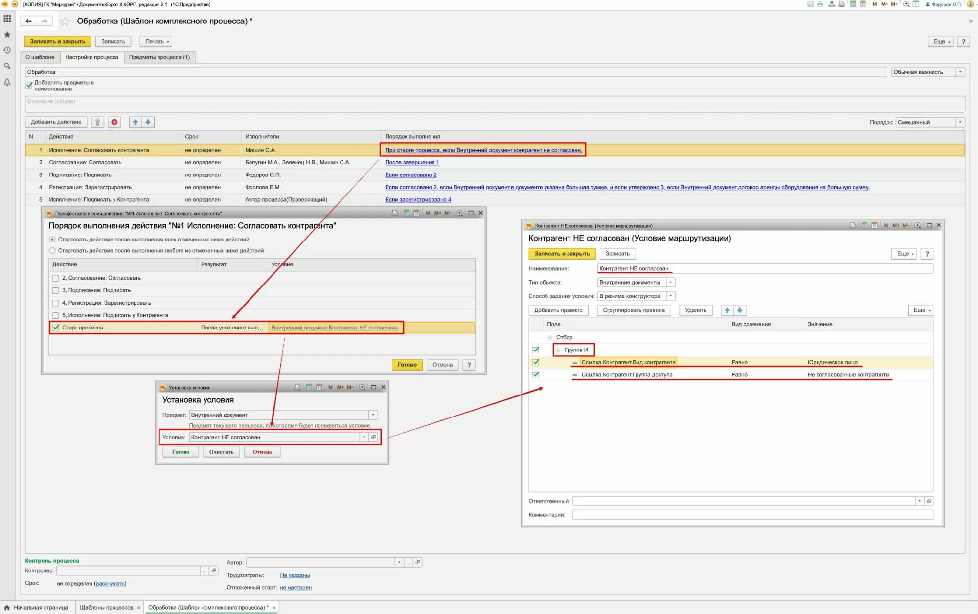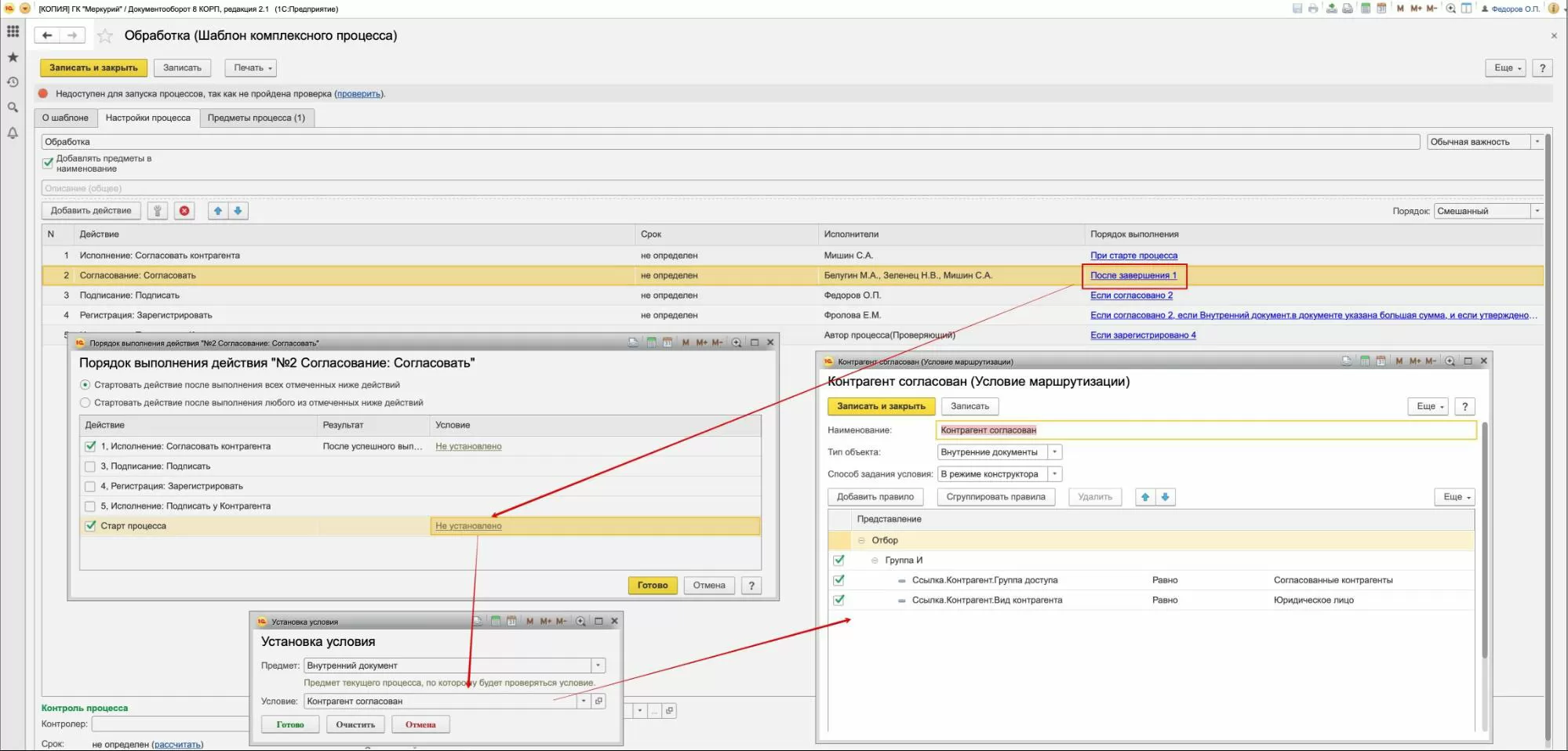 Например, в выше рассмотренном примере с согласованием контрагента по условию нужно обязательно предусмотреть вариант, когда контрагент согласован, и первый шаг запускаться не будет. Чтобы процесс не выдал ошибку, нужно во втором шаге включить условие При старте, обратное условию на первом шаге – Контрагент согласован.