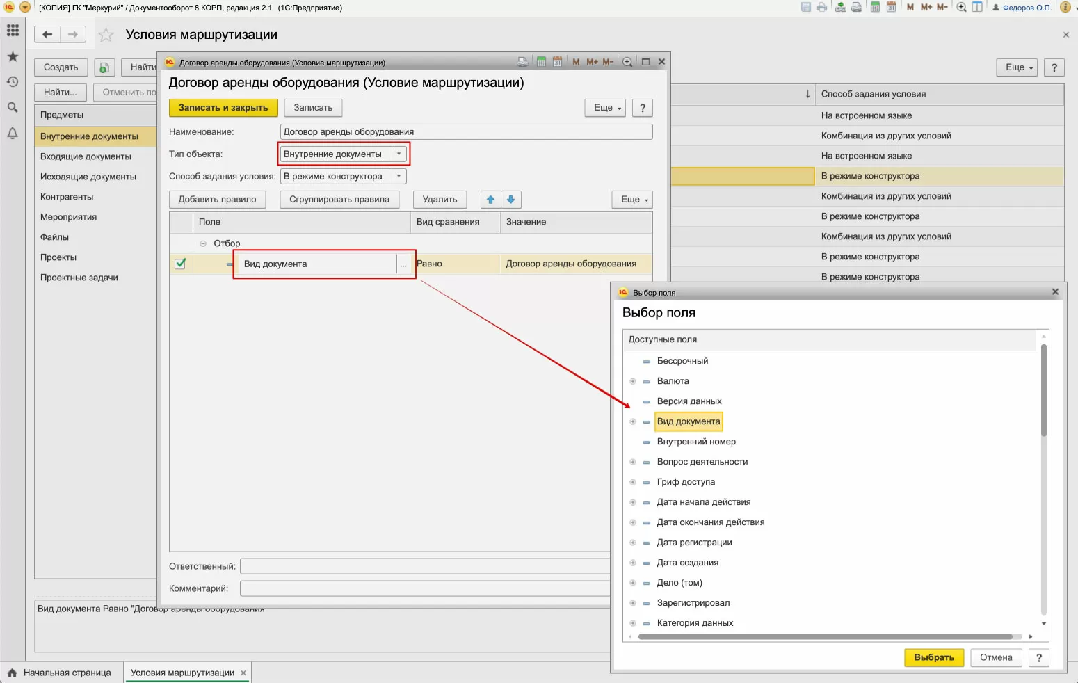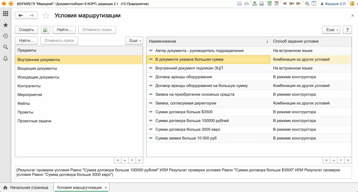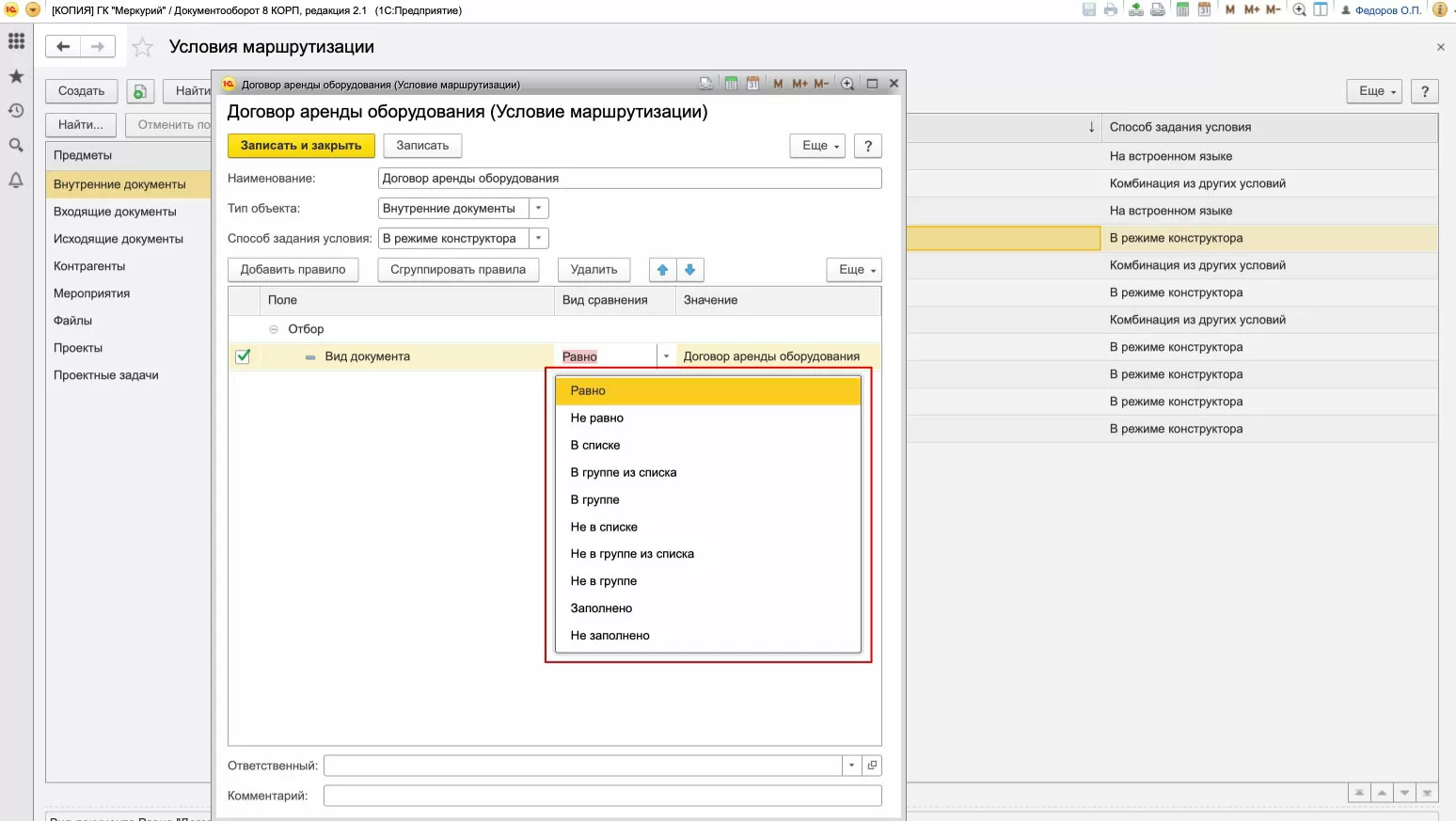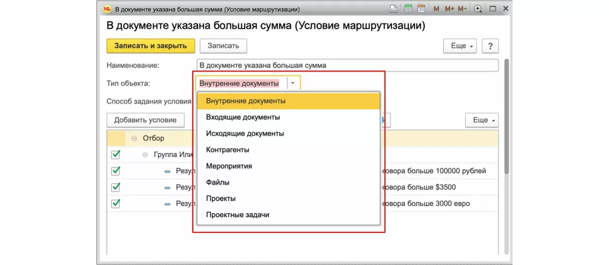 Такими объектами могут быть внутренние, входящие и исходящие документы, контрагенты, мероприятия, файлы, проекты и проектные задачи. Далее выбираем способ задания условия. Возможно три варианта: