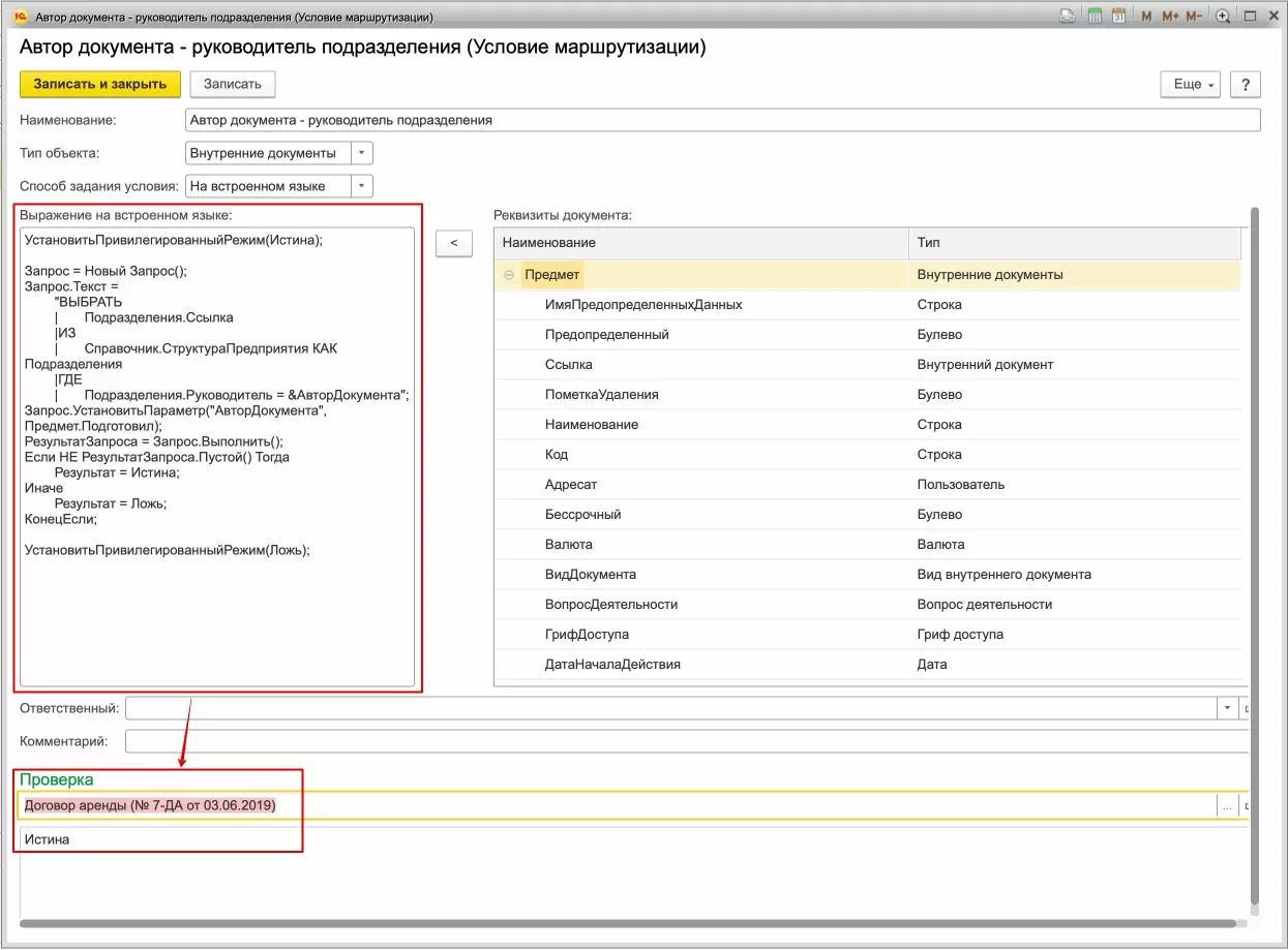 С правой стороны расположены реквизиты выбранного объекта для использования в выражениях встроенного языка. В этом же окне, не выходя из конструктора, можно проверить созданное условие на работоспособность. Безусловно, чтобы грамотно написать такое условие, нужны соответствующие знания и опыт разработки на языке 1С, то есть лучше всего привлечь для этого программиста 1С.