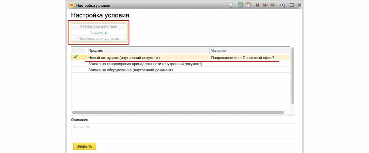 В настройке условия можно использовать результаты действий, предметы или создавать произвольные условия. Создание условий на основе предмета процесса мы уже рассматривали на примерах процессов с настройкой в таблице. Результат действий – настройка условия в зависимости от результата того или иного шага процесса, например, согласования с положительным результатом. Произвольное условие может быть построено на произвольных параметрах.