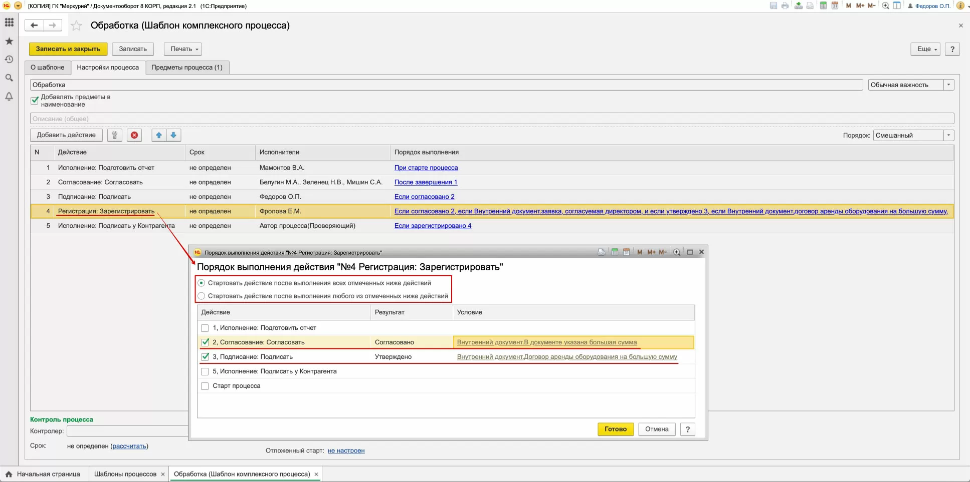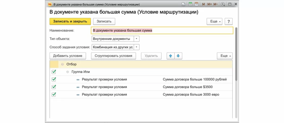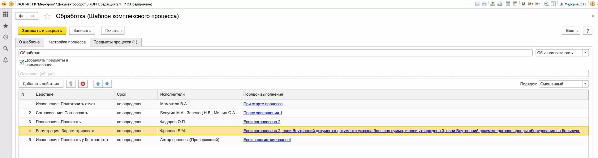 Используя условия, как внутри простых процессов, так и в порядке выполнения действий, сложные условия маршрутизации на встроенном языке, а также всевозможные комбинации сложных условий, можно построить сложнейшие бизнес-процессы обработки документов, согласования контрагентов и так далее.